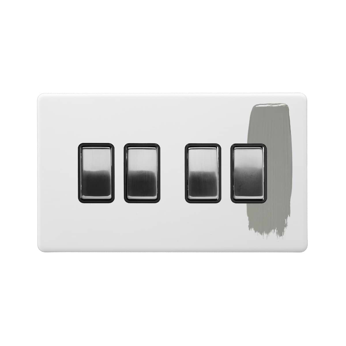 This Primed Paintable 4 Gang Intermediate switch with Brushed Chrome Switch and Black Insert is a luxury paintable primed plate with a brushed chrome switch. This innovative design allows you to match your switches and sockets with your preferred wall colour for a seamless finish.