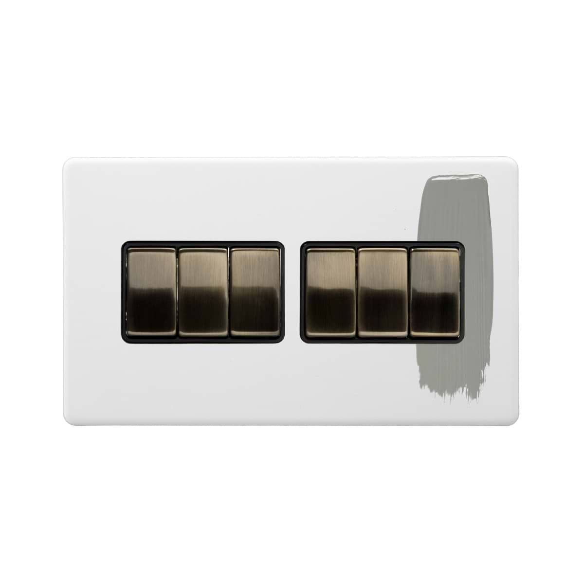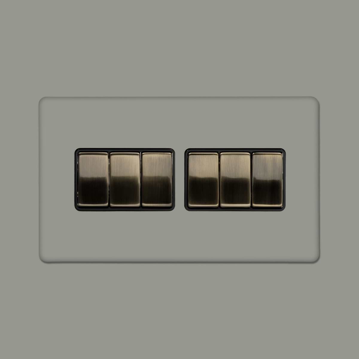 This Primed Paintable 6 Gang 2 Way 10A Light Switch with Antique Brass Switch is a luxury paintable primed plate with a antique brass switch. This innovative design allows you to match your switches and sockets with your preferred wall colour for a seamless finish.