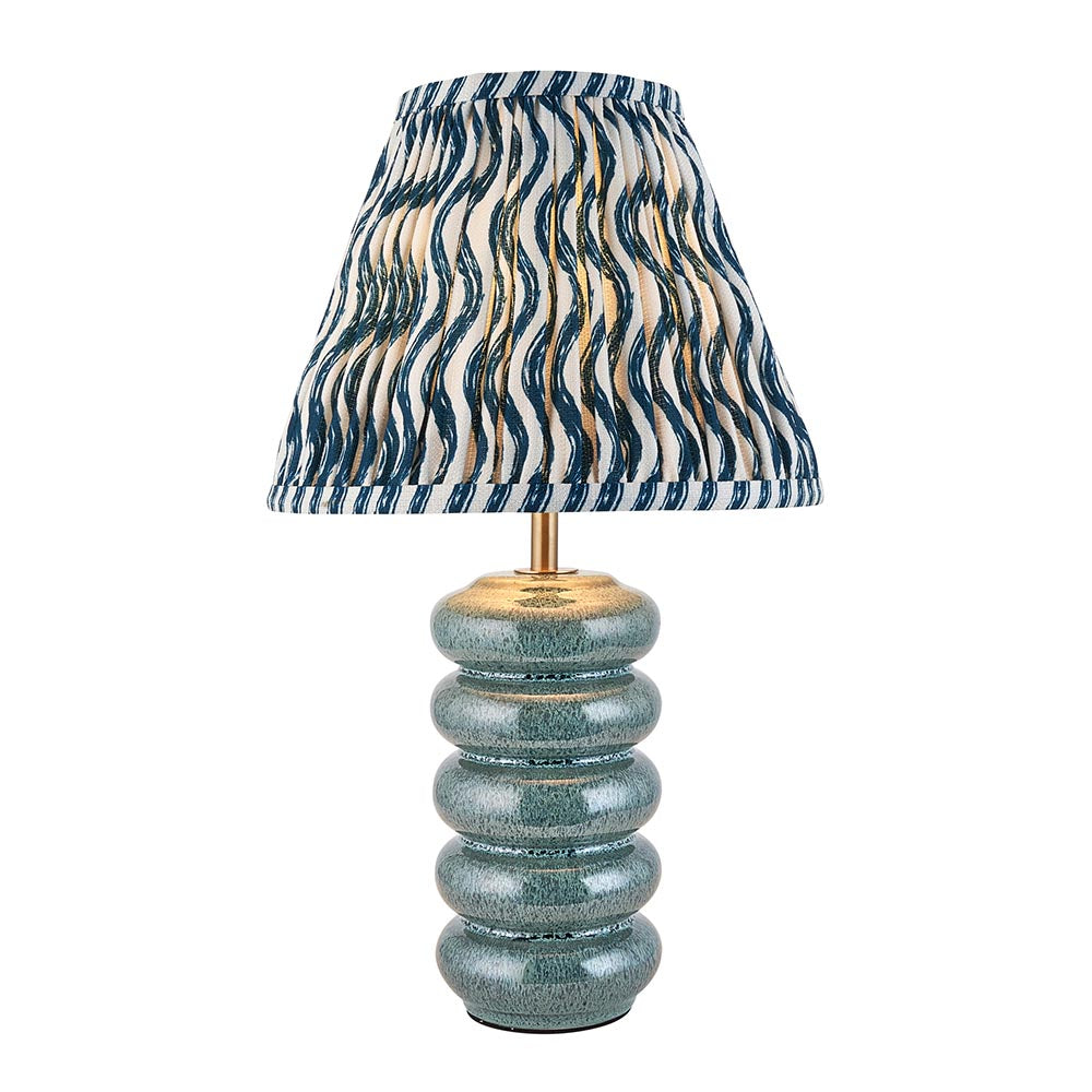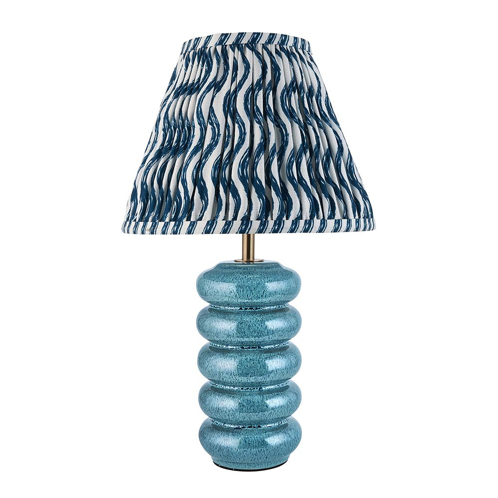 The delicate curves of this ceramic table light have been perfectly scaled to suit bedrooms and lounge interiors. The handmade ceramic base is finished in a beautiful ocean spray colour reactive glaze, making each piece unique; with a brushed aged brass B22 switched lamp holder and grey braided flex. Paired with our vibrant marlin blue 25cm Ripple shade.