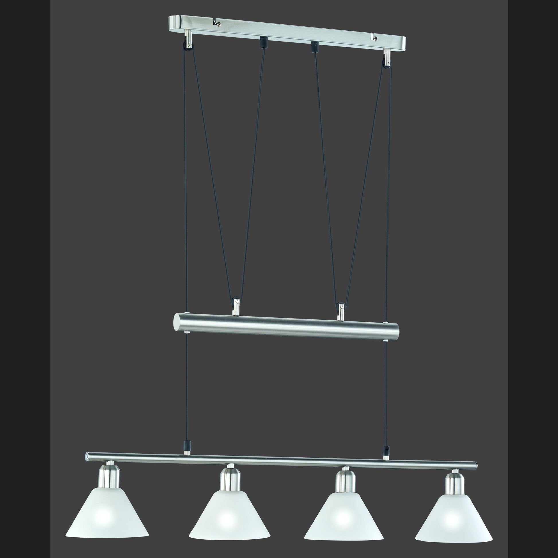 The height-adjustable STAMINA light creates pleasant lighting in your living area with its light and is particularly suitable for use above the dining table or similar. The width is 80cm and the height is adjustable from 80 to 180cm. The appealing silhouette together with the frame in matt nickel and the glass lampshades in opal white create an elegant look. For energy-saving lighting, it is recommended to use an LED illuminant. These are an optimal alternative to conventional halogen lamps and stand for a high quality of light and energy savings of up to 80%. In addition, LED lamps help you benefit from a long service life, low heat generation and at the same time protect the environment.