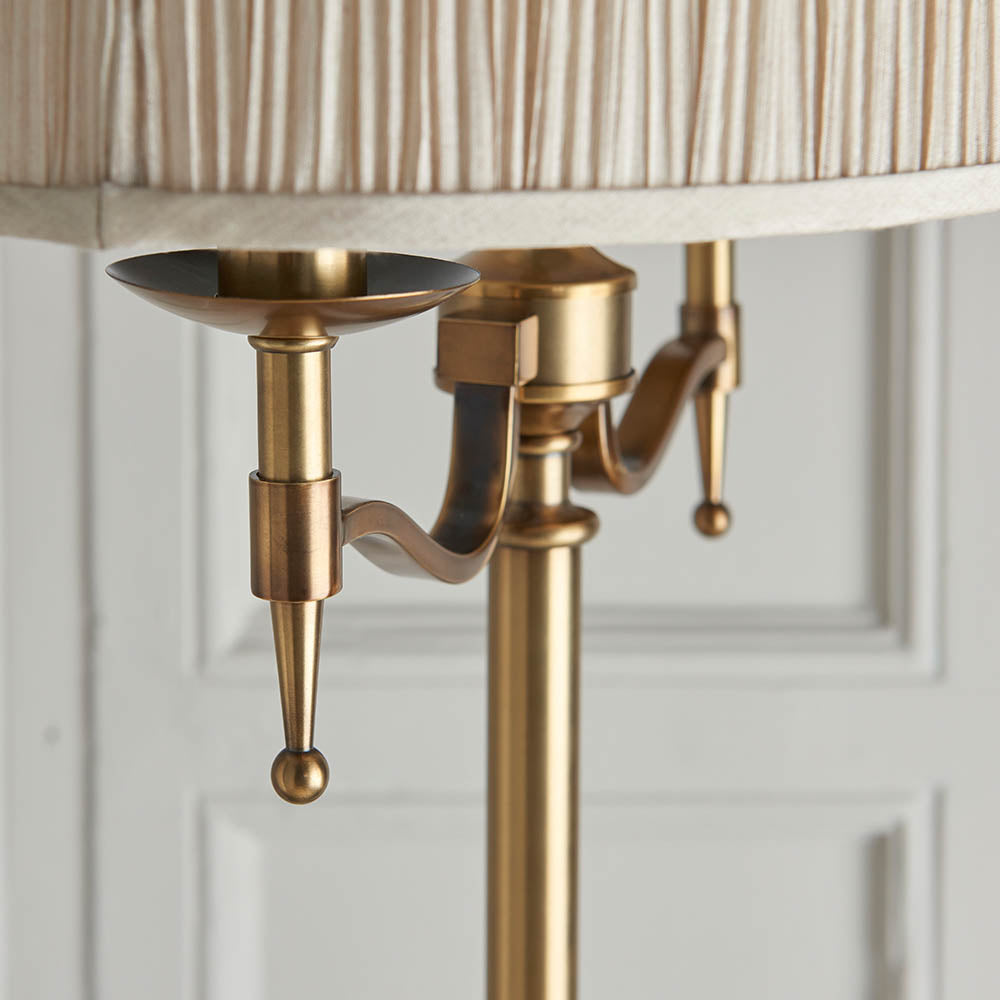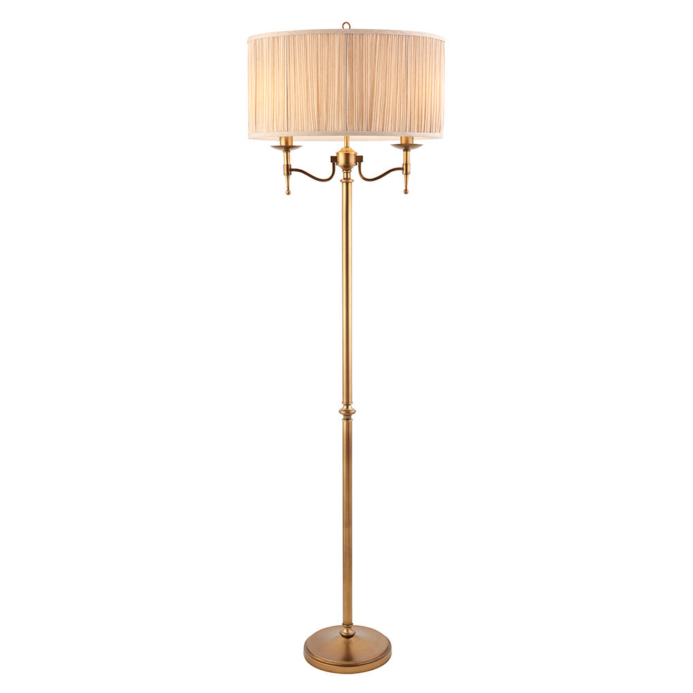 The classic style Stanford twin floor light finished in antique brass with angular arms and a beige shade, giving it a classical twist on its contemporary styling. Matching items available.