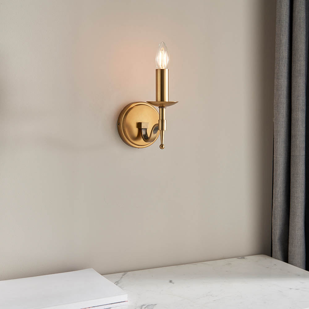 This elegant wall light from the Stanford antique brass range has beautifully curved arms and simple clean detailing. Matching items available