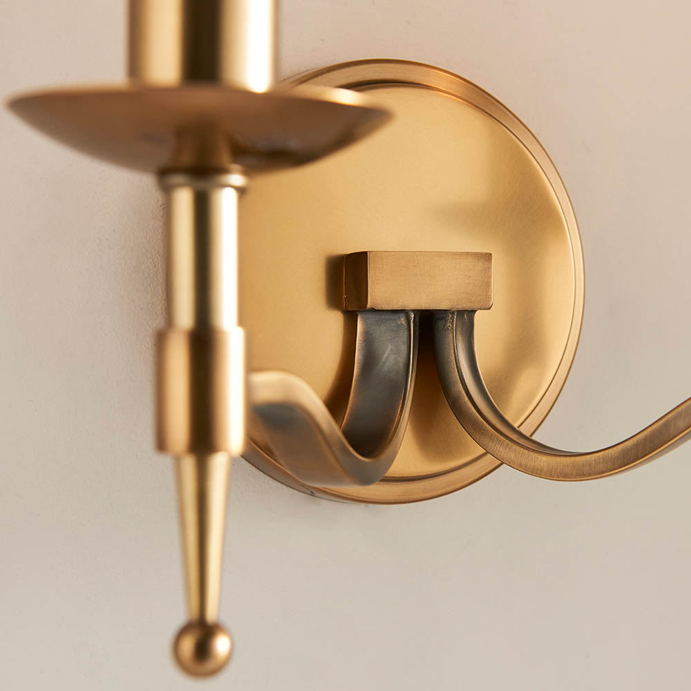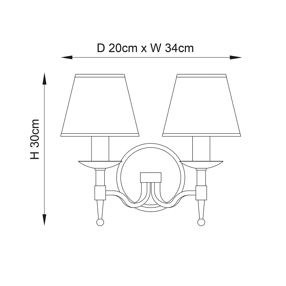 This elegant twin wall light from the Stanford antique brass range has beautifully curved arms and simple clean detailing. Its complemented by pretty, beige organza effect shades. Matching items available