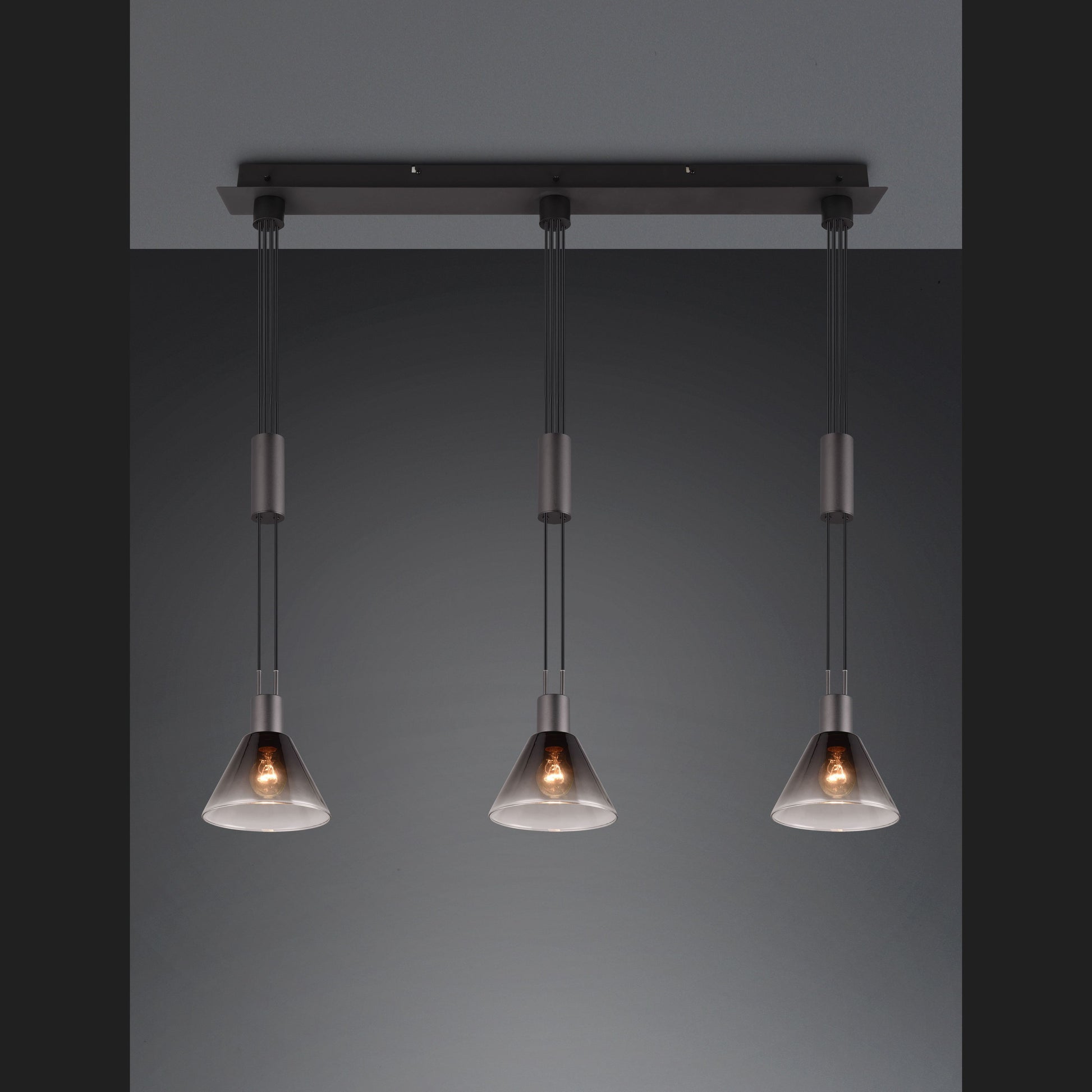 The two-light STANLEY pendant light sets special lighting accents in your living room. The colour scheme and the design of the glass create a magical flair and an elegant play of light above your dining or living room table. The height-adjustable elements allow for flexible light distribution according to your needs and round off your ambience perfectly. The black matt metal and the smoke-coloured glass shade exude coolness and modernity in your living area. The use of LED light sources is recommended for energy-saving lighting. These are an ideal alternative to conventional halogen light sources and offer high light quality and energy savings of up to 80%. With LED light sources, you also benefit from a long service life and low heat generation while protecting the environment.
