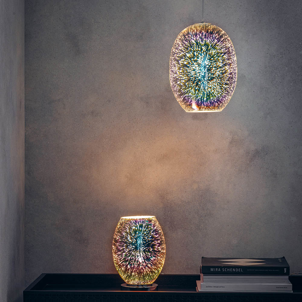 A captivating 'holographic' style light effect glass table light, featuring a versatile touch on/off base. Perfect for use with filament LED lamps. Twin, for full light effect with the single ceiling pendant, these eye-catching lights look fantastic used individually or together. Due to the nature of the product and its manufacture, there may be variations in pattern, colour and finish.