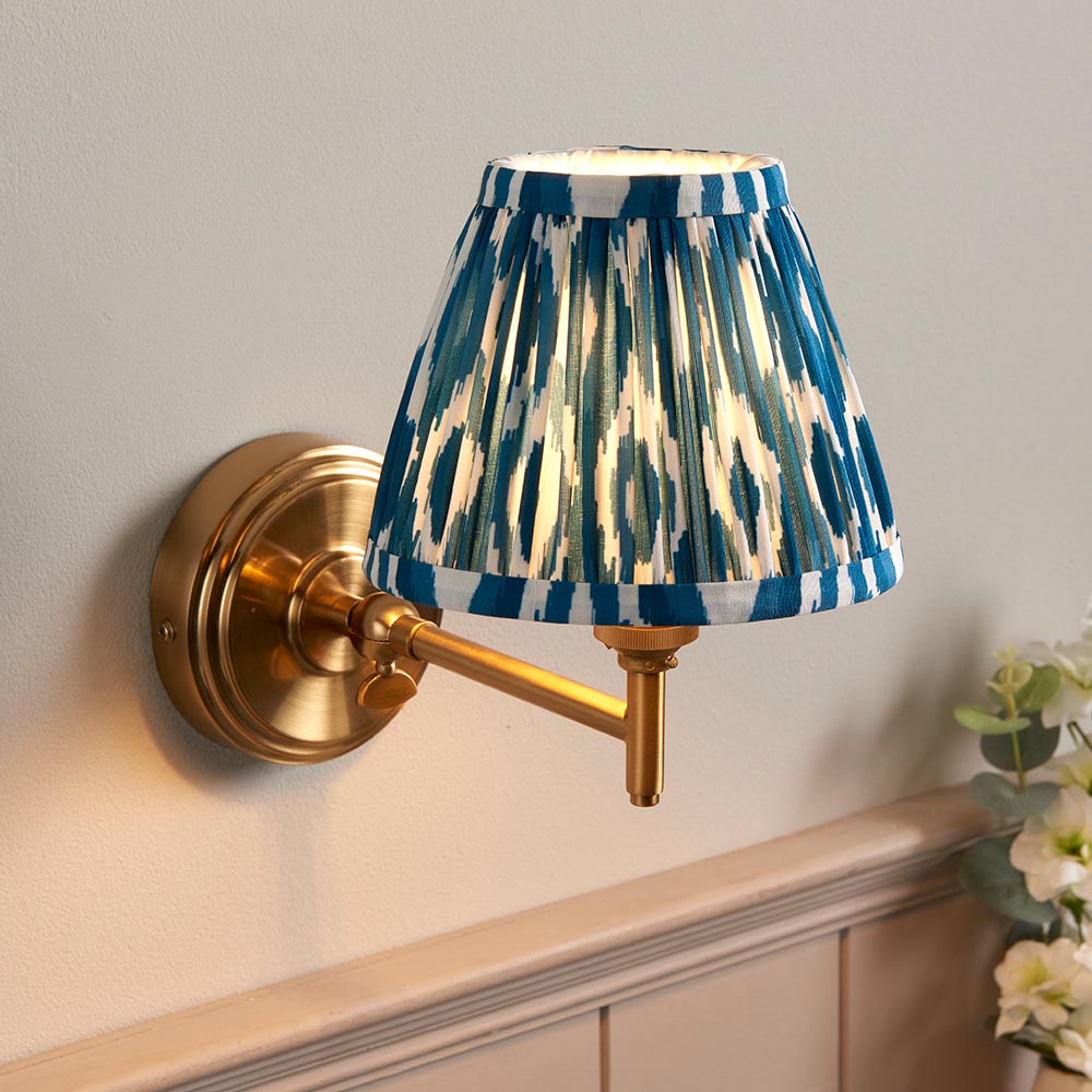 A classic stepped wall light with a simple linear arm, featuring an adjustable knuckle to fold and reposition the light. Perfect for bedsides and finished in brushed aged brass, this light is paired with our vibrant marlin blue 16cm Ikat shade for a timeless look.