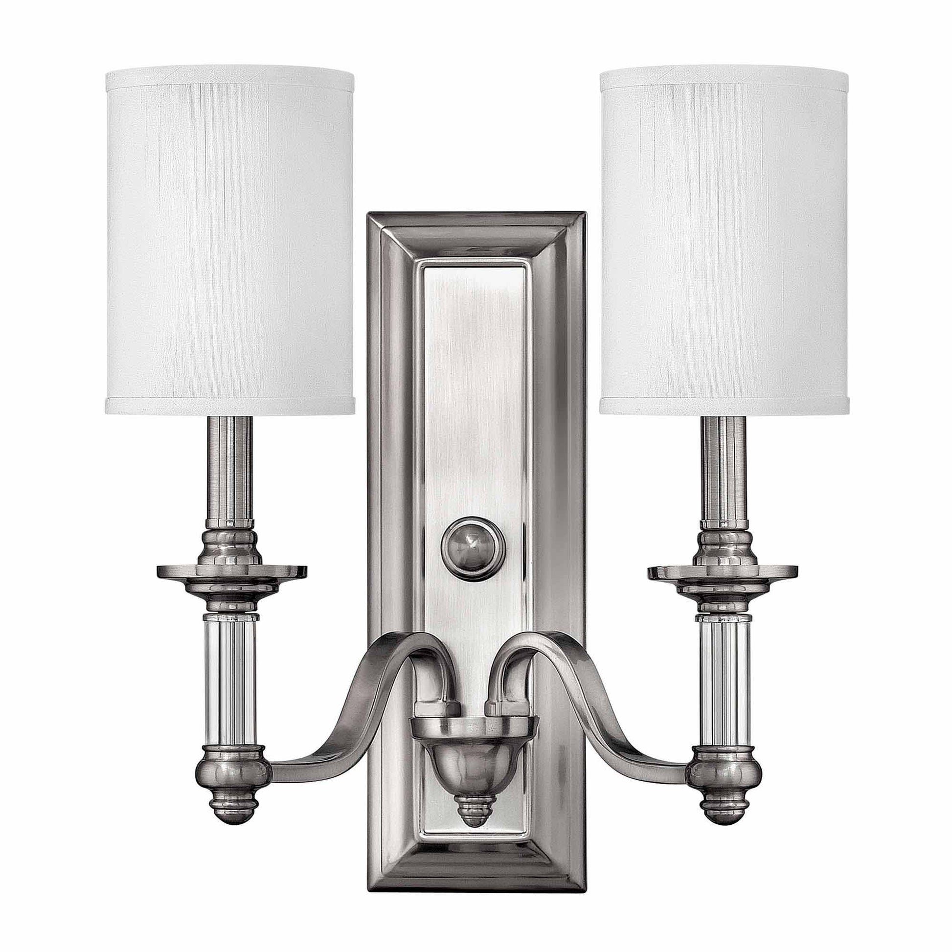 Sussex offers traditional charm with an edge of modern luxury. The Brushed Nickel finish, white fabric hard back shade and clear glass column and candles adds to its sophistication.