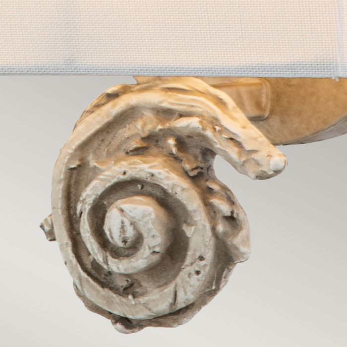 The Swirl 1 light small wall light is a cast resin motif finished in an antiqued bone white finish. This Flambeau design is completed with a rectangular shaped linen shade and ideal for residential or hospitality settings.