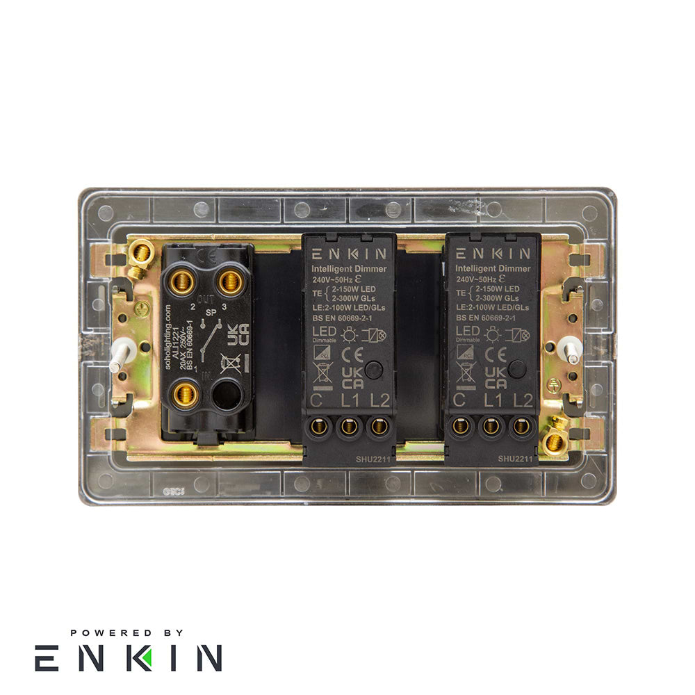 This dimmer/toggle switch comes with award winning Enkin PDM150. This is a 2-way Intelligent Dimmer, LED compatible dimmer switch with soft-start technology that slowly brings the lights to the set level in about 1-2 second, prolonging the life of your lightbulbs, as well as an easy push button setup for seamless installation. Enkin modules are silent and flicker-free With short circuit and overload protection, and a self-recovering thermal fuse, the award-winning technology that makes up Enkin modules provides safety and reliability to a previously overlooked element of your home lighting.