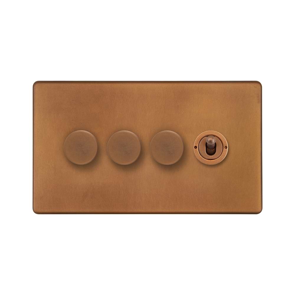 The Chiswick Collection Antique Copper 4 Gang Switch with 3 Dimmers (3x150W LED Dimmer 1x20A 2 Way Toggle)