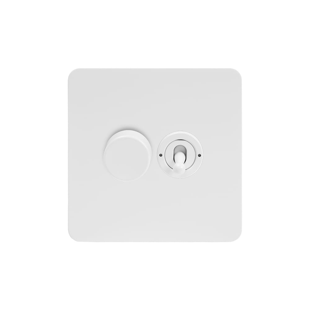 The Eldon Collection White Metal Flat Plate 2 Gang Dimmer and Toggle Switch Combo (1x150W LED Dimmer 1x20A 2 Way Toggle)