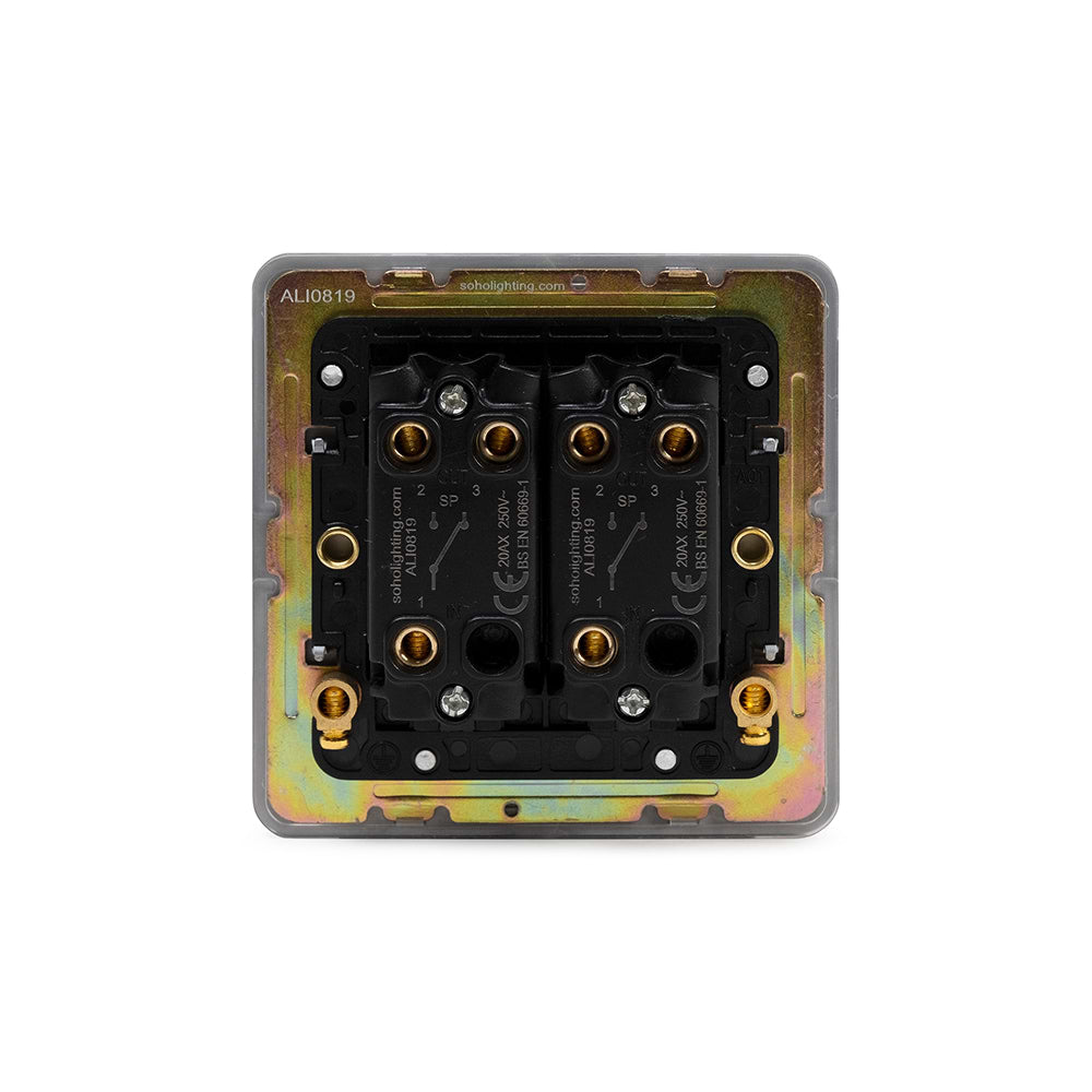 The fresh, clean look and neutral screwless finish of this screwless White Metal Flat Plate 20A 2 Gang 2 Way Toggle Switch from Soho Lighting complements all interior design styles and finishes. The Eldon Collection is a popular choice for modern and contemporary styled homes and works seamlessly in white kitchens and rooms with neutral colours and clean lines.