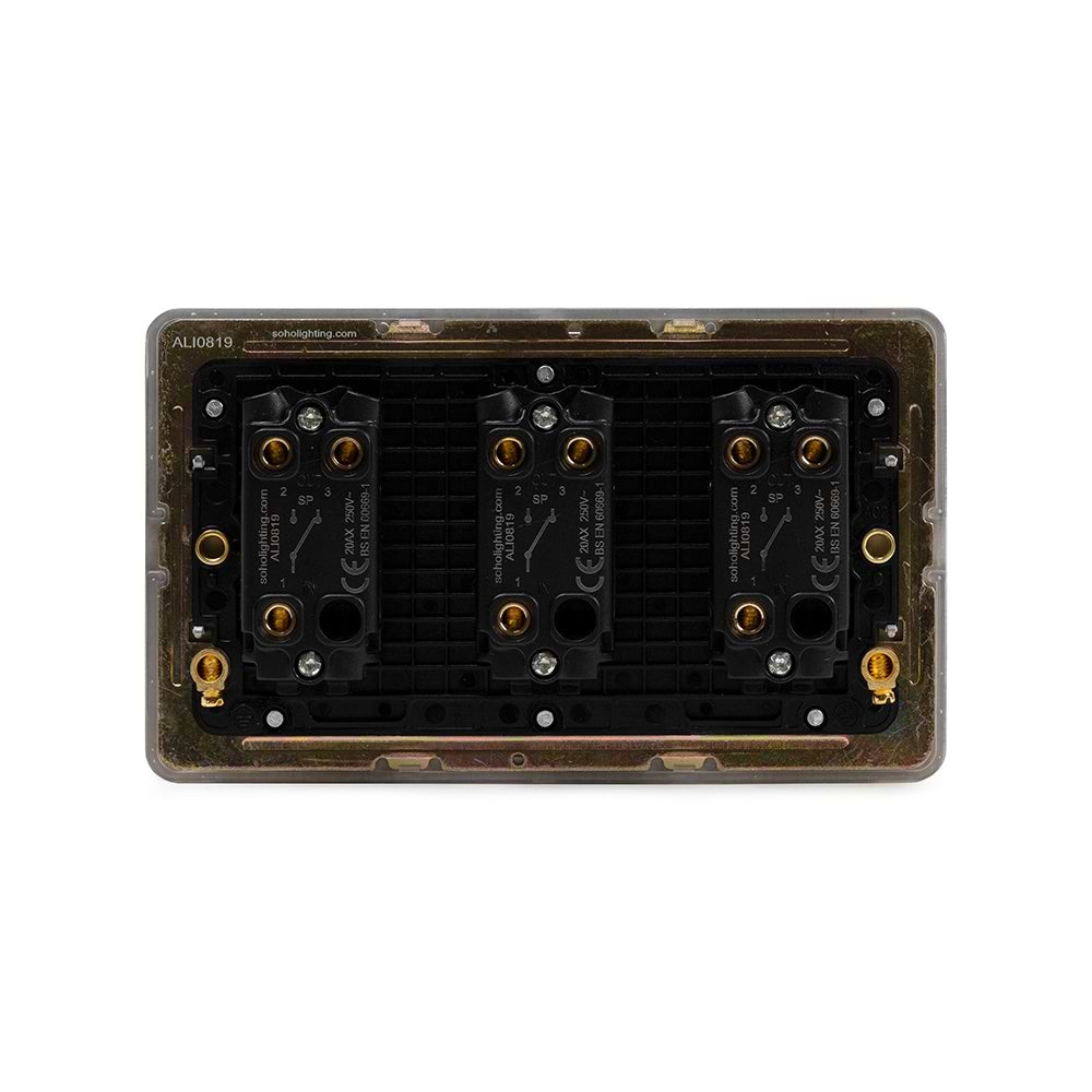 The fresh, clean look and neutral screwless finish of this screwless White Metal Flat Plate 20A 3 Gang 2 Way Toggle Switch from Soho Lighting complements all interior design styles and finishes. The Eldon Collection is a popular choice for modern and contemporary styled homes and works seamlessly in white kitchens and rooms with neutral colours and clean lines.