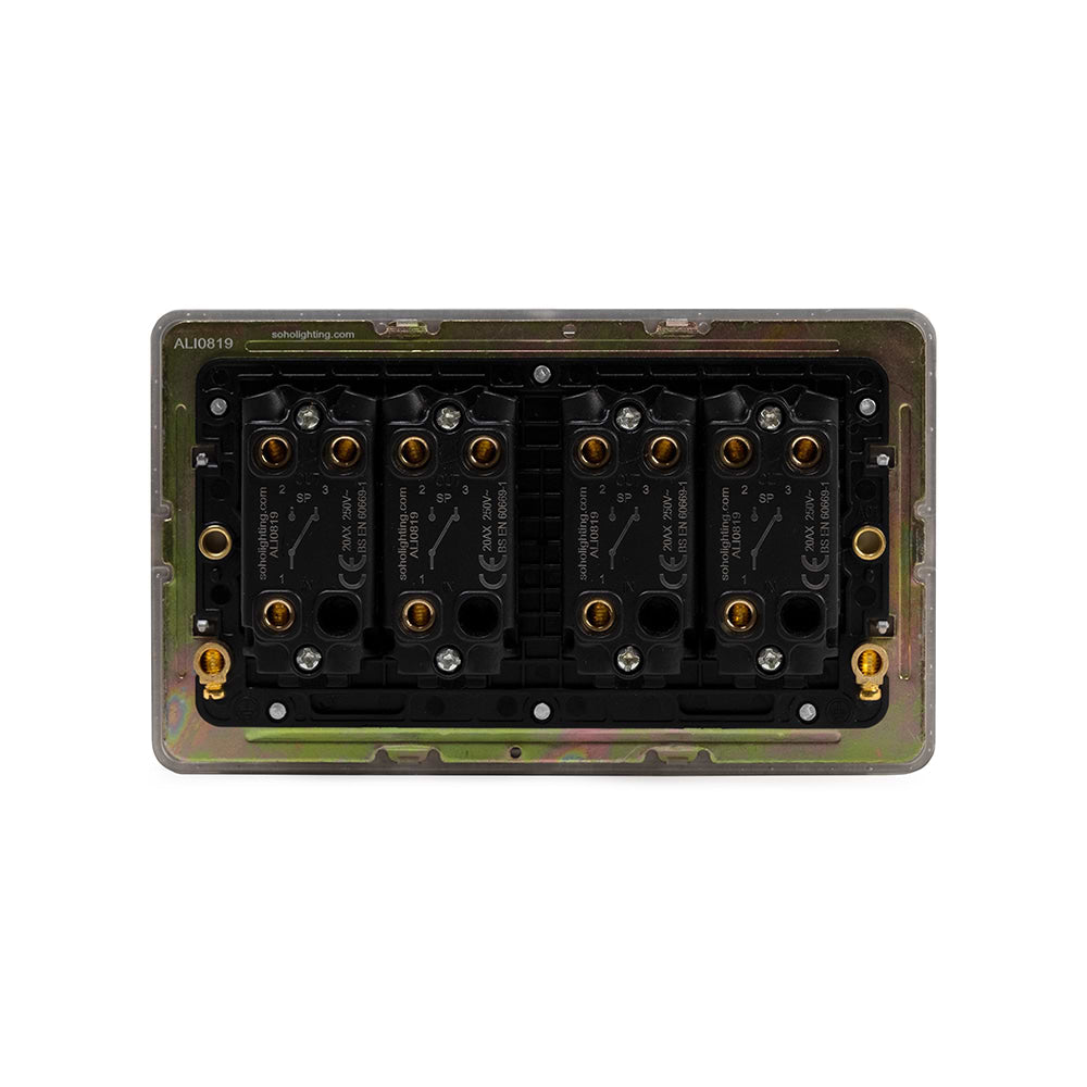 The fresh, clean look and neutral screwless finish of this screwless White Metal Flat Plate 20A 4 Gang 2 Way Toggle Switch from Soho Lighting complements all interior design styles and finishes. The Eldon Collection is a popular choice for modern and contemporary styled homes and works seamlessly in white kitchens and rooms with neutral colours and clean lines.