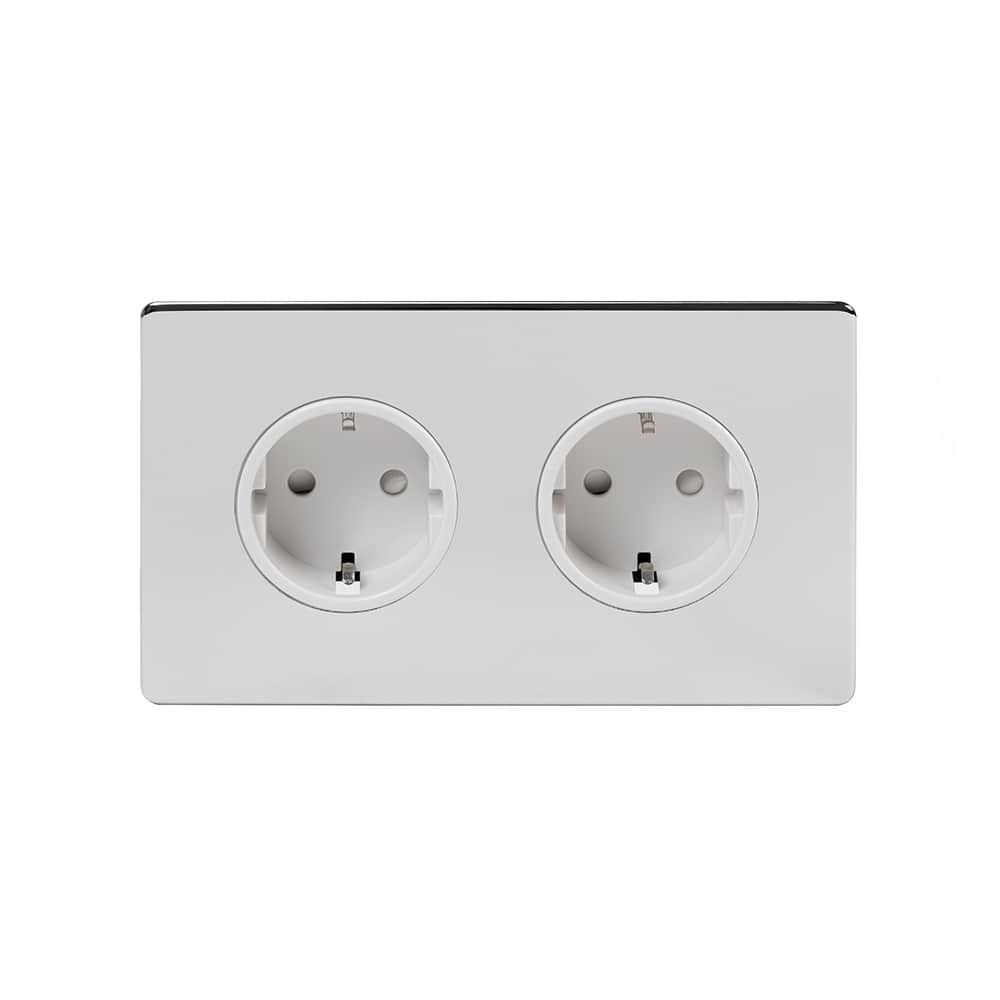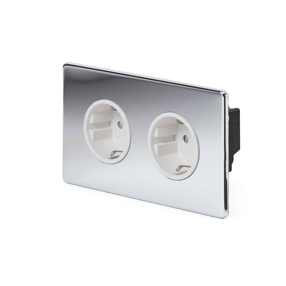 The Finsbury Collection Polished Chrome 16A 2 Gang Euro Schuko Socket Wht Ins Screwless