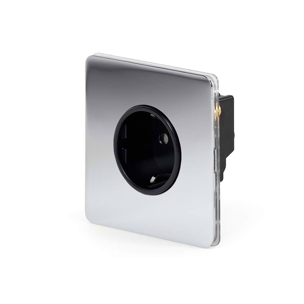 The Finsbury Collection Polished Chrome Flat Plate 16A 1 Gang Euro Schuko Socket Blk Ins Screwless