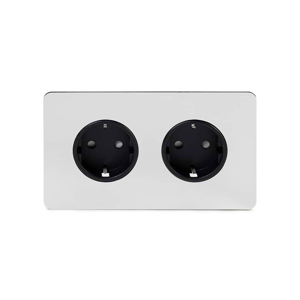 The Finsbury Collection Polished Chrome Flat Plate 16A 2 Gang Euro Schuko Socket Blk Ins Screwless