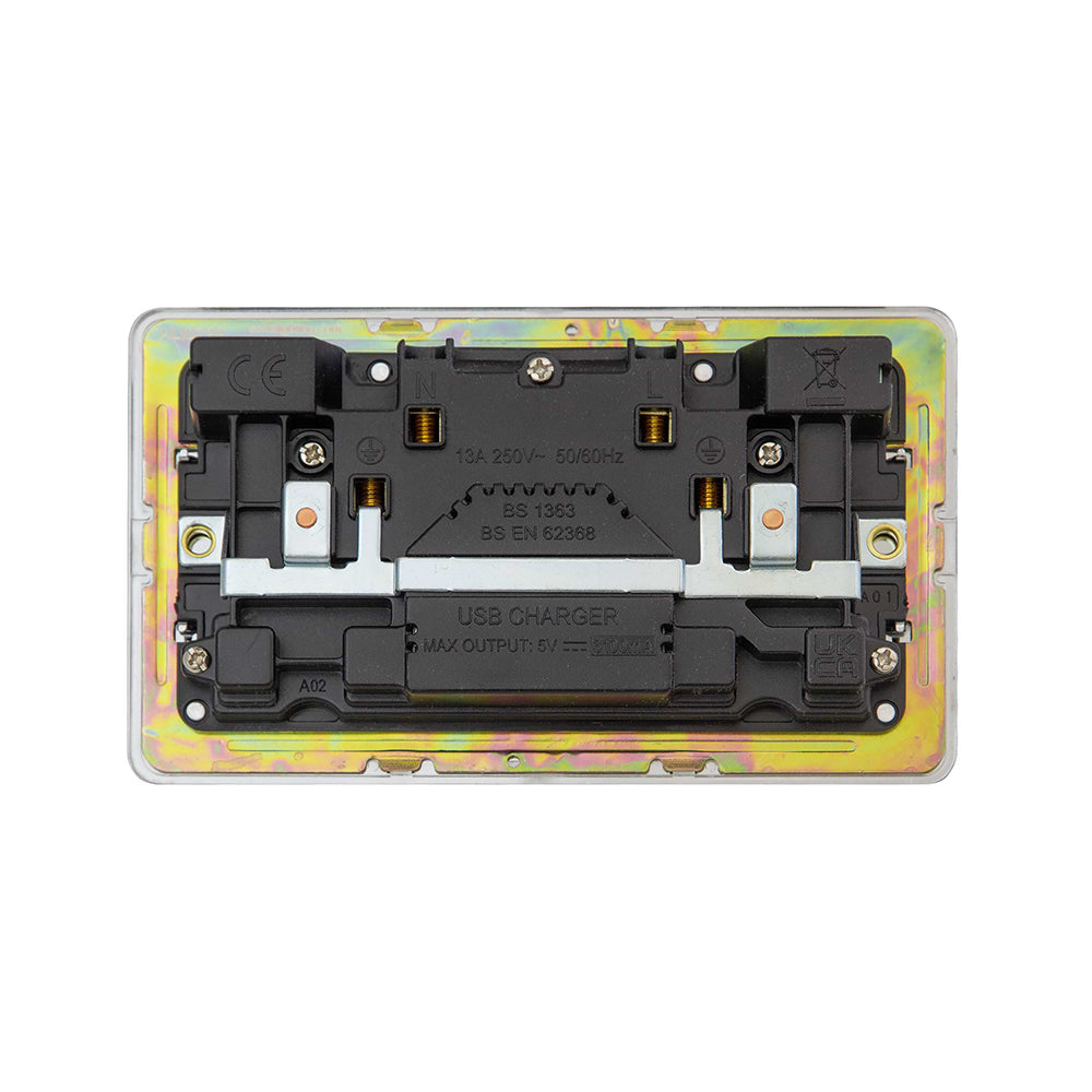 This Polished Chrome Flat Plate 2 Gang USB A+C Socket (13A Socket + 2 USB Ports A+C 3.1A) complements period styles such as art deco, arts and crafts and other homes of distinction. It looks particularly striking when set against darker finishes, wood or panelling. Polished chrome is a popular choice for bathrooms and kitchens as it often harmonises with other polished chrome fittings, such as taps, towel rails or appliances.