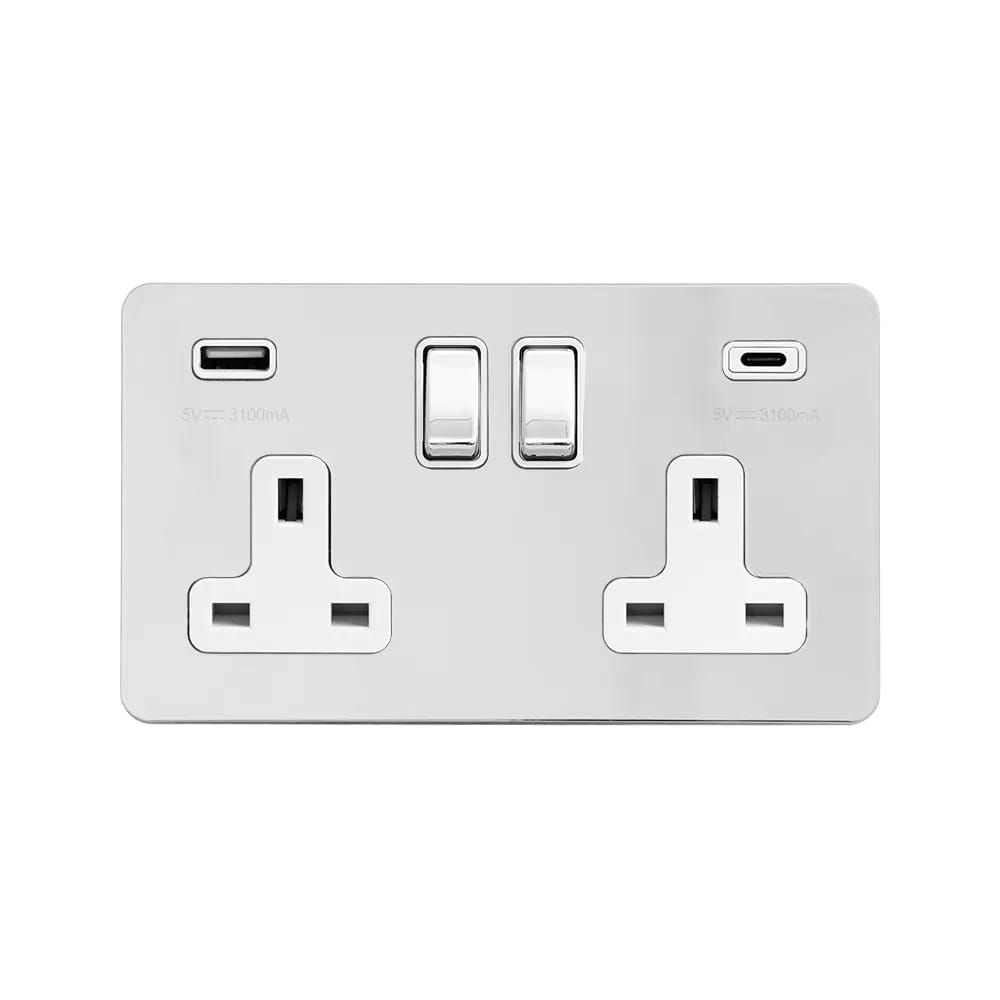 The Finsbury Collection Polished Chrome Flat Plate 2 Gang USB A+C Socket (13A Socket + 2 USB Ports A+C 3.1A)