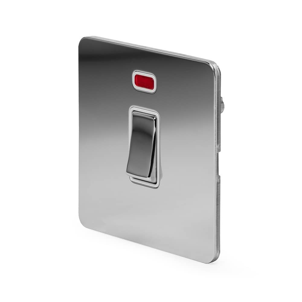 The Finsbury Collection Polished Chrome Flat Plate 20A 1 Gang Double Pole Switch With Neon Wht Ins Screwless