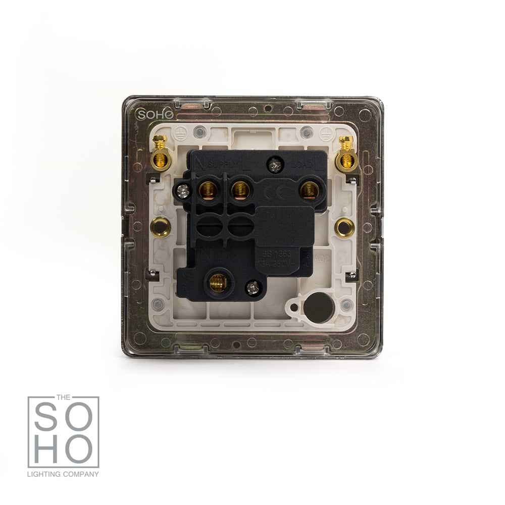 Polished Chrome is generally considered to suit modern/contemporary styles. However, this Polished chrome metal plate 13A Double Pole Switched Fuse Connection Unit with black insertalso complements period styles such as art deco, arts and crafts and other homes of distinction. It looks particularly striking when set against darker finishes, wood or panelling. The Finsbury collection is a popular choice for bathrooms and kitchens as it often harmonises with other polished chrome fittings, such as taps, towel rails or appliances.