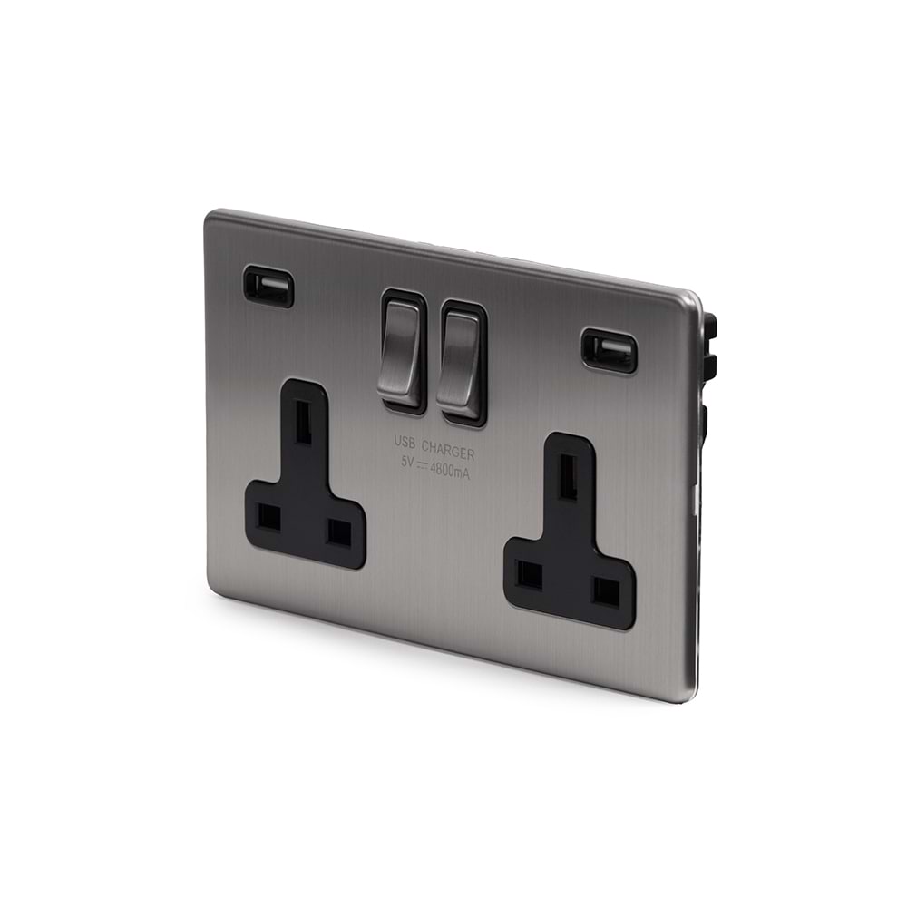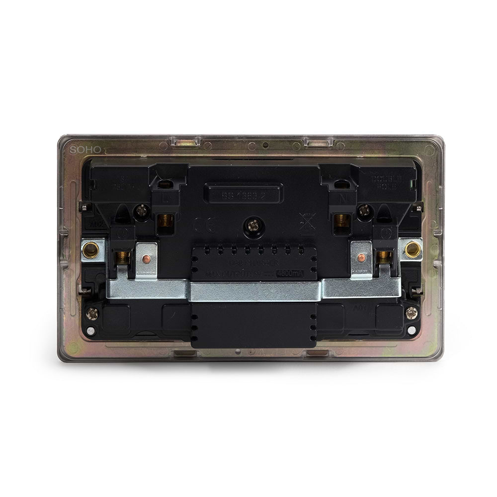 This luxury Soho Lighting Brushed Chrome 13A 2 Gang DP USB-A Socket (USB Output 4.8amp) has a distinctive appearance and the stylish screwless finish provides a warmer tone than polished chrome and has the added benefit of hiding fingerprints and small blemishes. The smooth, rounded edges and subtle lustre and sheen finish give this collection an understated style which makes it compatible with most interiors making it a very popular choice.