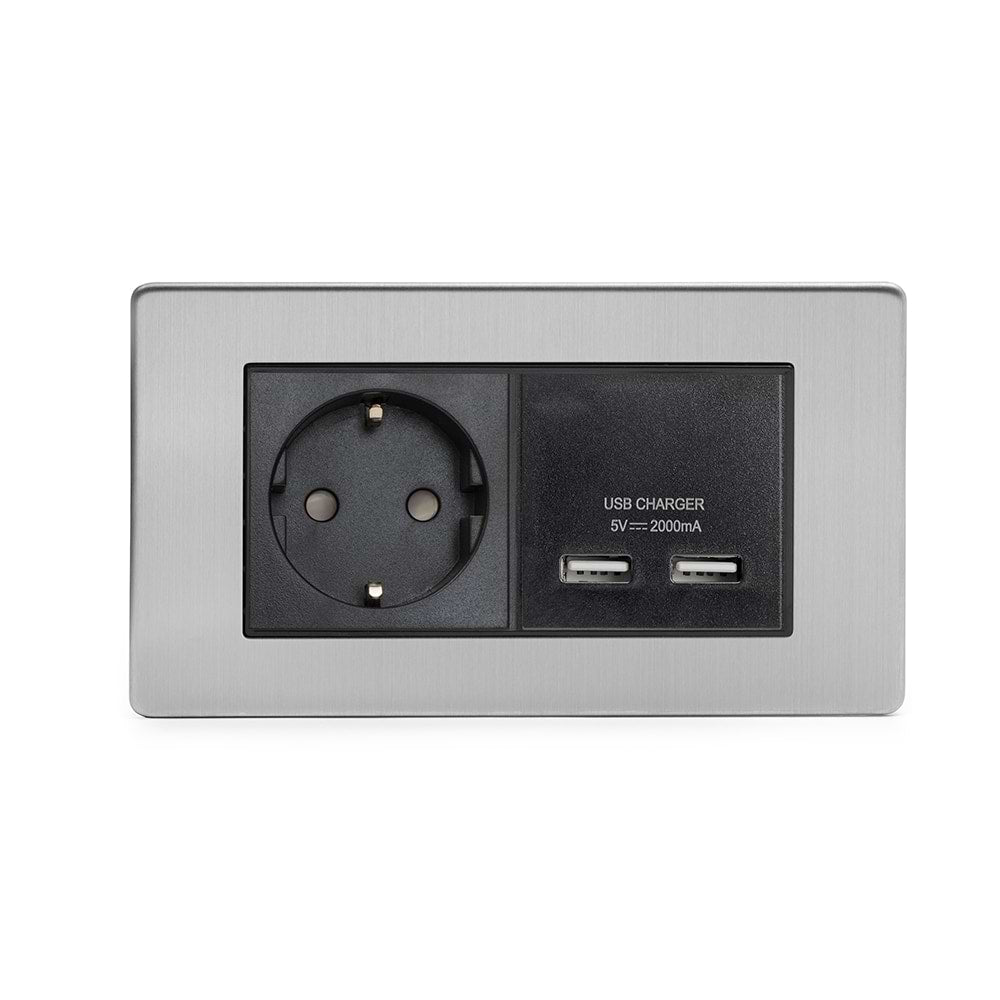 The Lombard Collection Brushed Chrome 2 Gang European Schuko Socket with USB Blk Ins Screwless