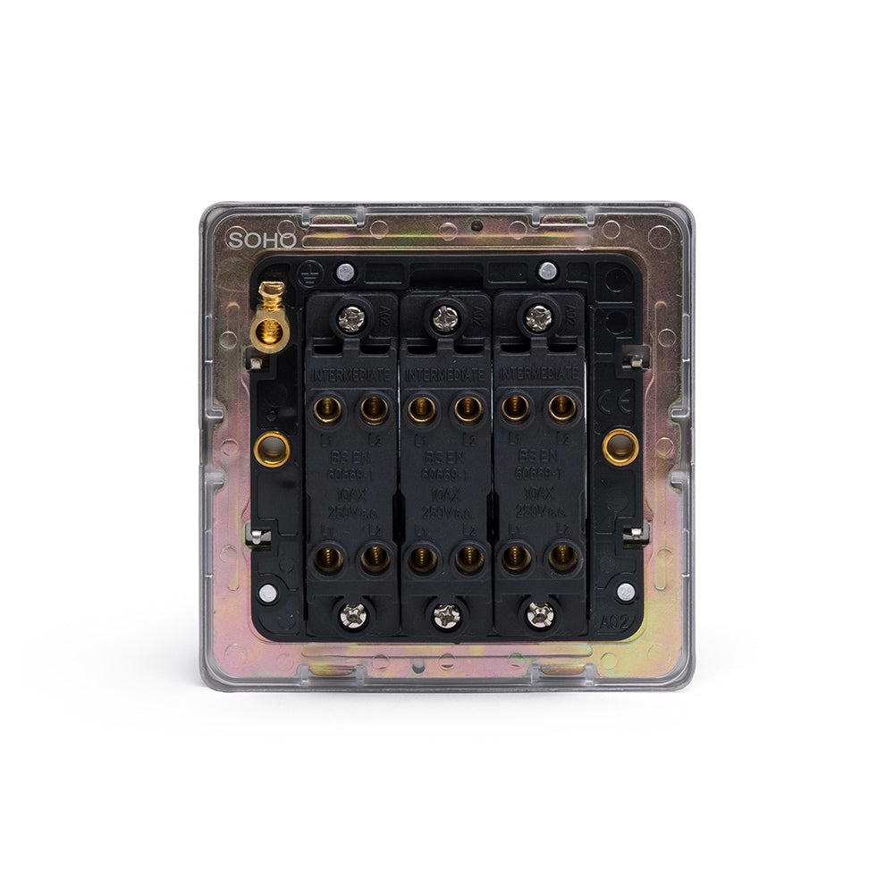 Socket and switch finishes are an important consideration for interior design and styling and should be chosen to match their surroundings. If you have brushed chrome finishes in your kitchen (unit handles/appliances) or bathroom (towel rails etc), then this Brushed Chrome 3 Gang Intermediate Switch will provide the perfect compliment. They work particularly well in modern and contemporary spaces and high traffic areas or for young families.