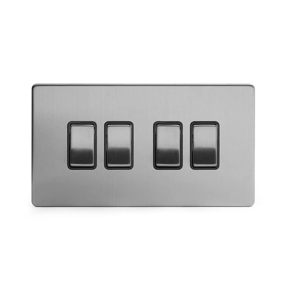 This Brushed Chrome 4 Gang Intermediate Switch with Black Insert has a distinctive appearance and the stylish screwless finish provides a warmer tone than polished chrome and has the added benefit of hiding fingerprints and small blemishes. The smooth, rounded edges and subtle lustre and sheen finish give this collection an understated style which makes it compatible with most interiors making it a very popular choice.
