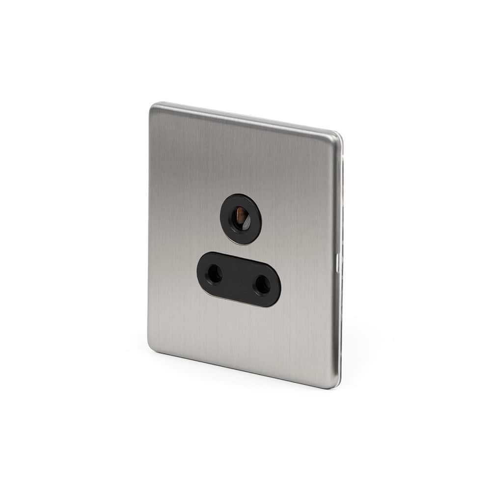 This Brushed chrome unswitched 5a socket with black insert has a distinctive appearance and the stylish screwless finish provides a warmer tone than polished chrome and has the added benefit of hiding fingerprints and small blemishes. The smooth, rounded edges and subtle lustre and sheen finish give this collection an understated style which makes it compatible with most interiors making it a very popular choice.