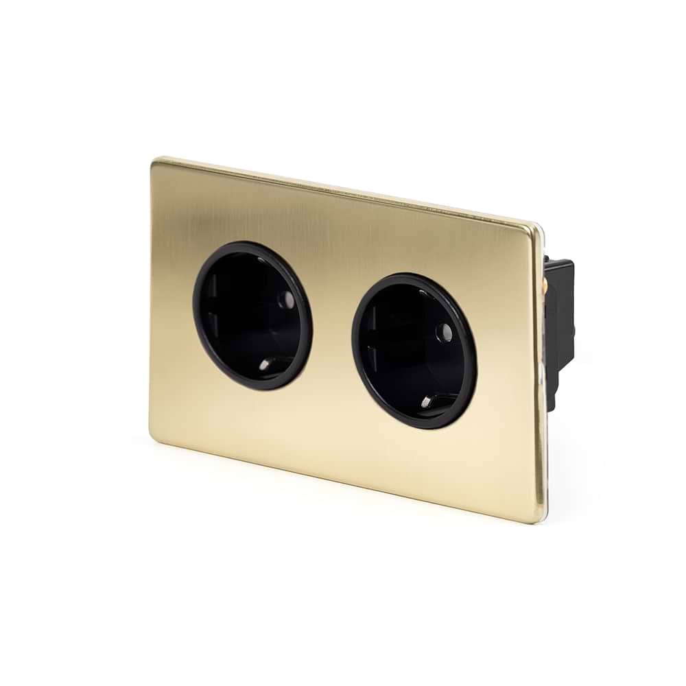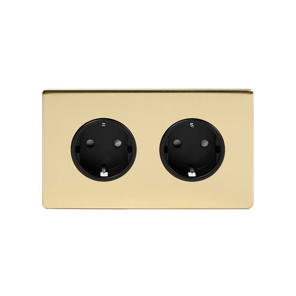 The Savoy Collection Brushed Brass 16A 2 Gang Euro Schuko Socket Blk Ins Screwless