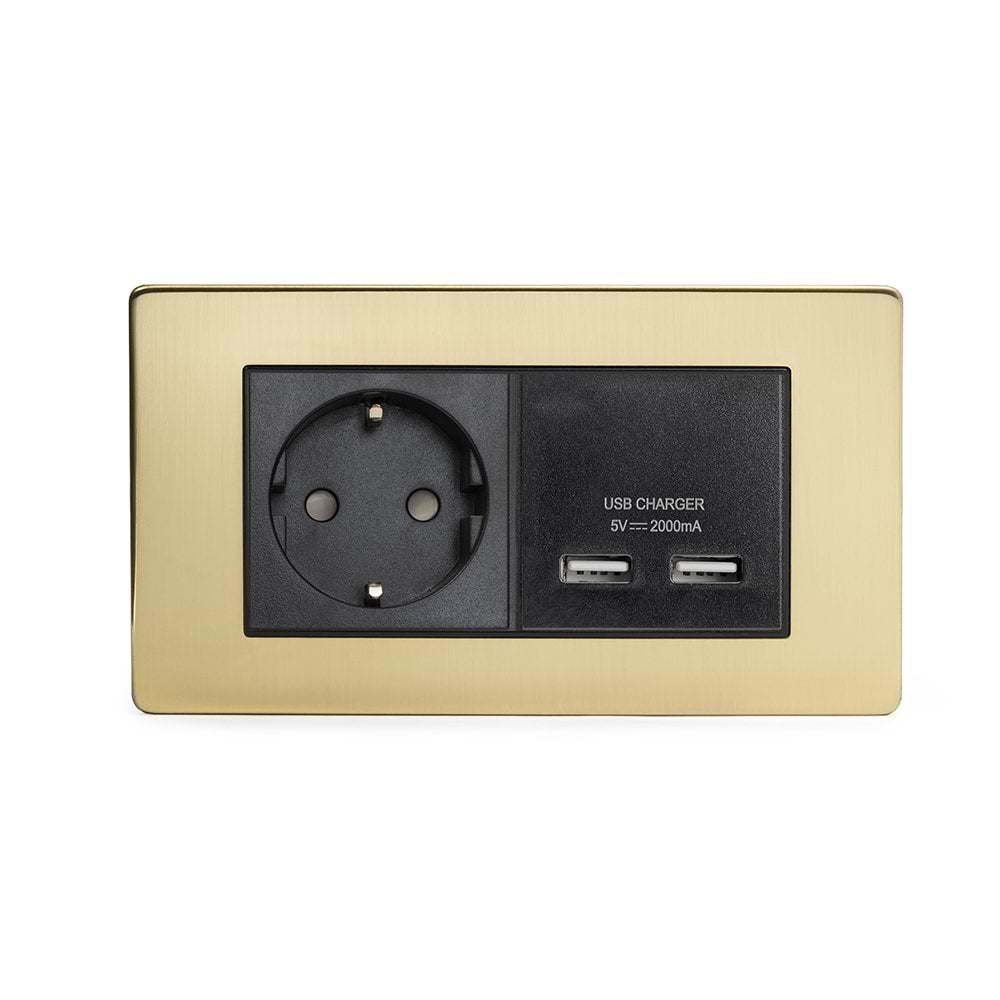 The Savoy Collection Brushed Brass 2 Gang European Schuko Socket with USB Blk Ins Screwless