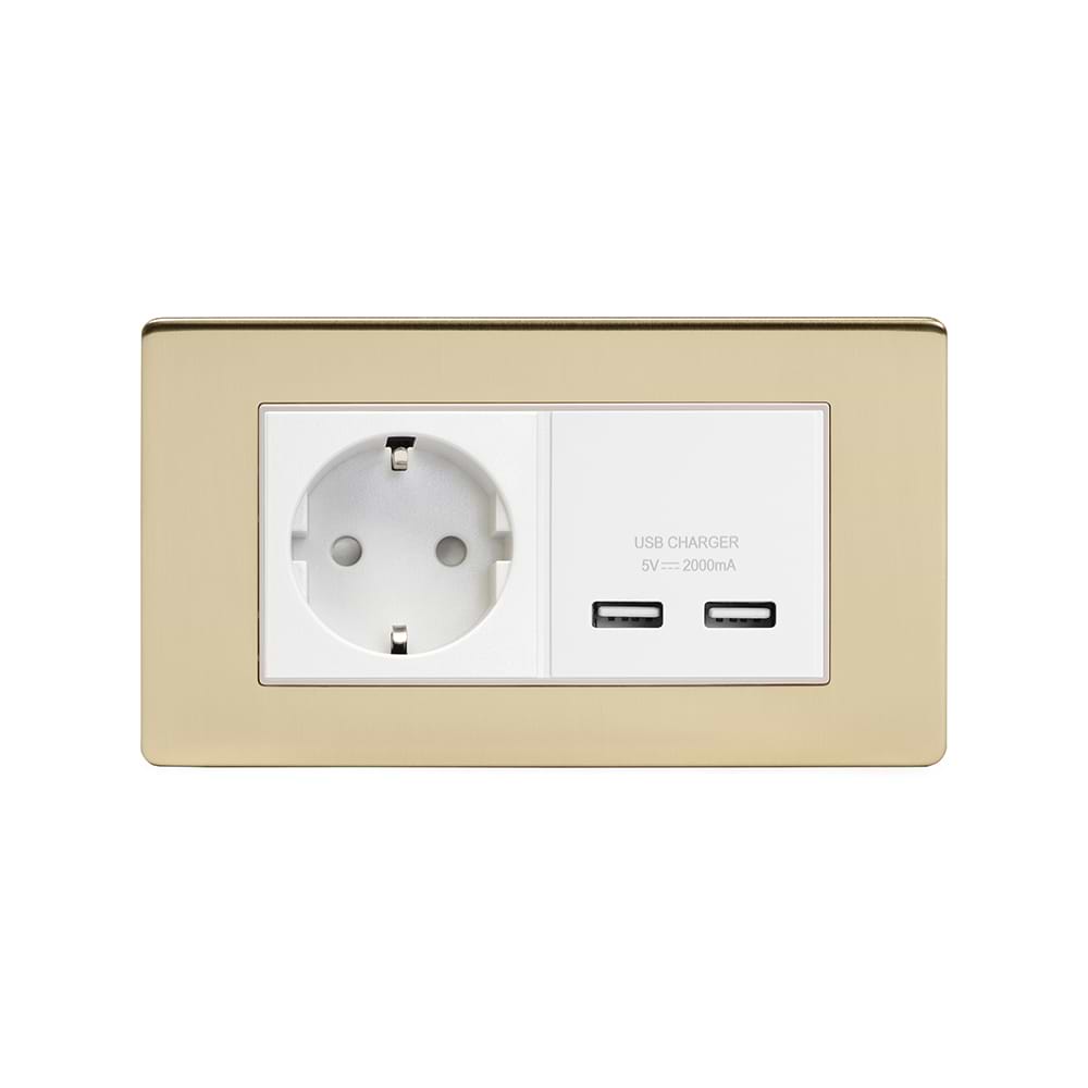 The Savoy Collection Brushed Brass 2 Gang European Schuko Socket with USB Wht Ins Screwless