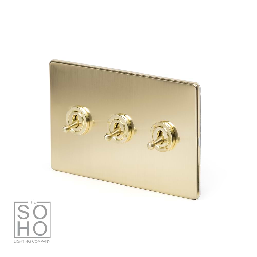 The Savoy Collection Brushed Brass 3 Gang 2 Way Toggle Switch Screwless
