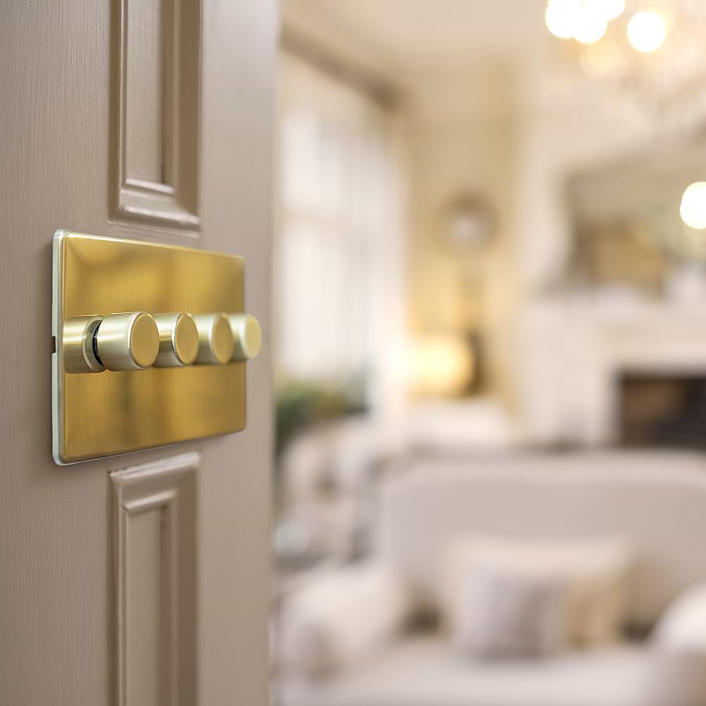 This luxury Brushed Brass Screwless 4 Gang 2 Way Intelligent Dimmer Switch 150W LED (300w Halogen/Incandescent) carrys a distinctive look and elegant finish, providing a warmer tone than typical new polished brass switches and sockets and has the added benefit of hiding fingerprints and small blemishes.