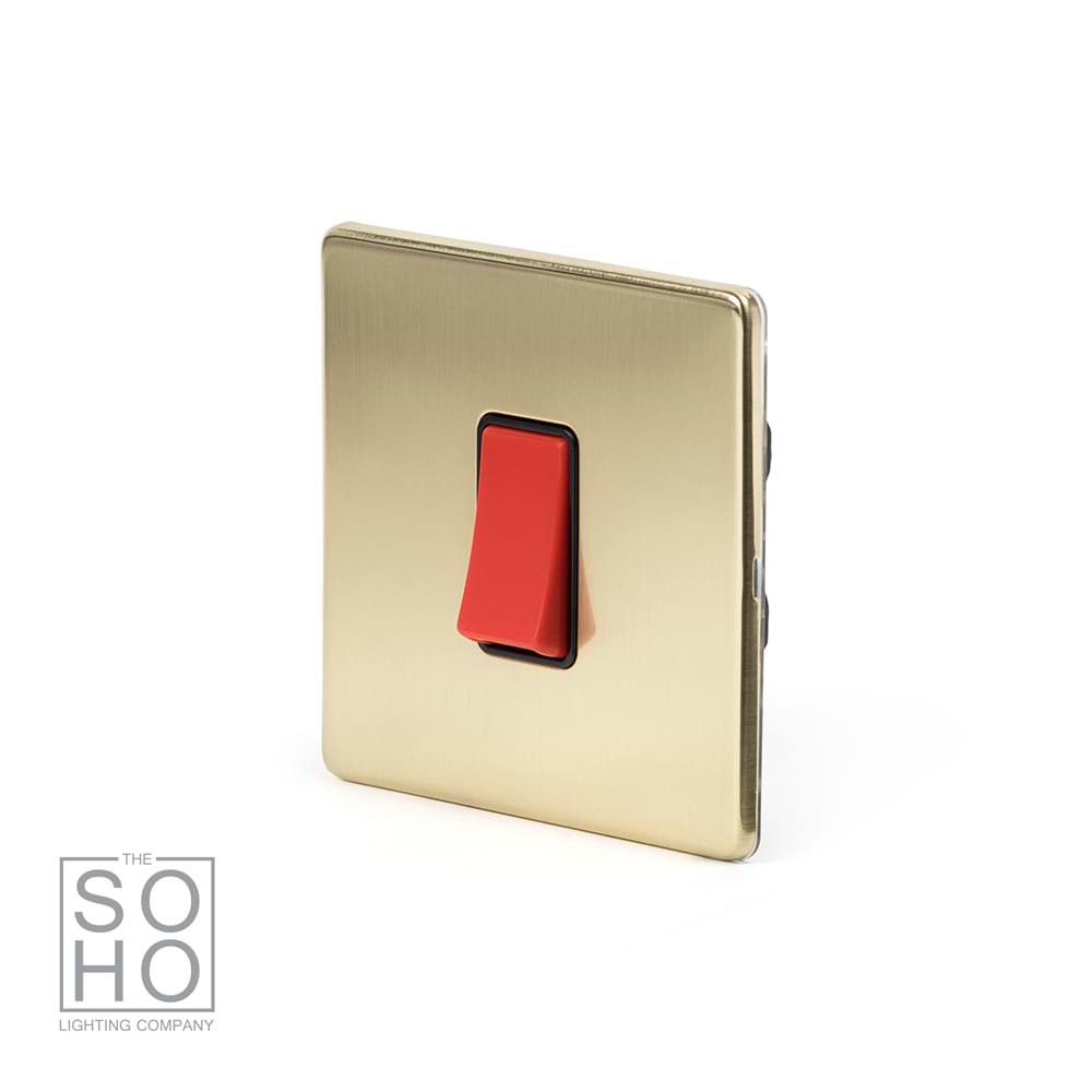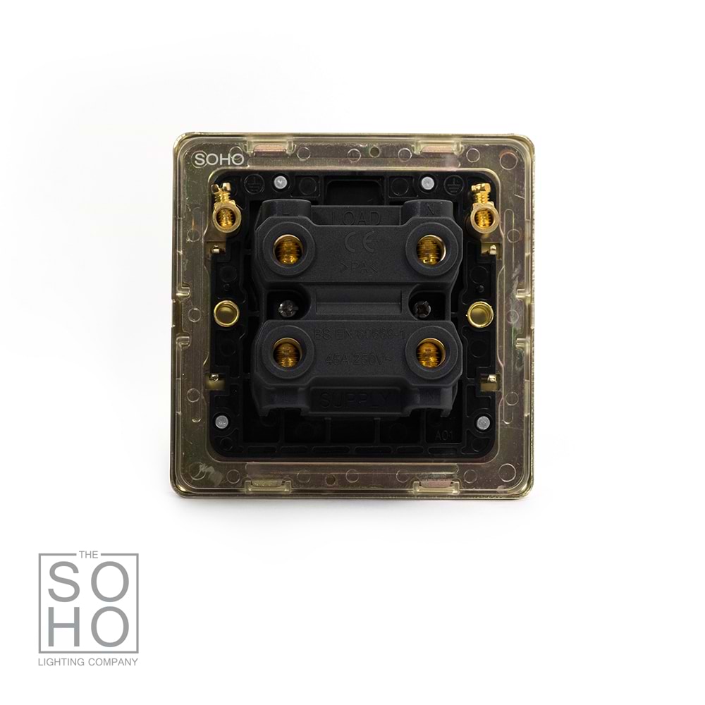 The Savoy Collection Brushed Brass 45A 1 Gang Double Pole Switch Single Plate Blk Ins Screwless