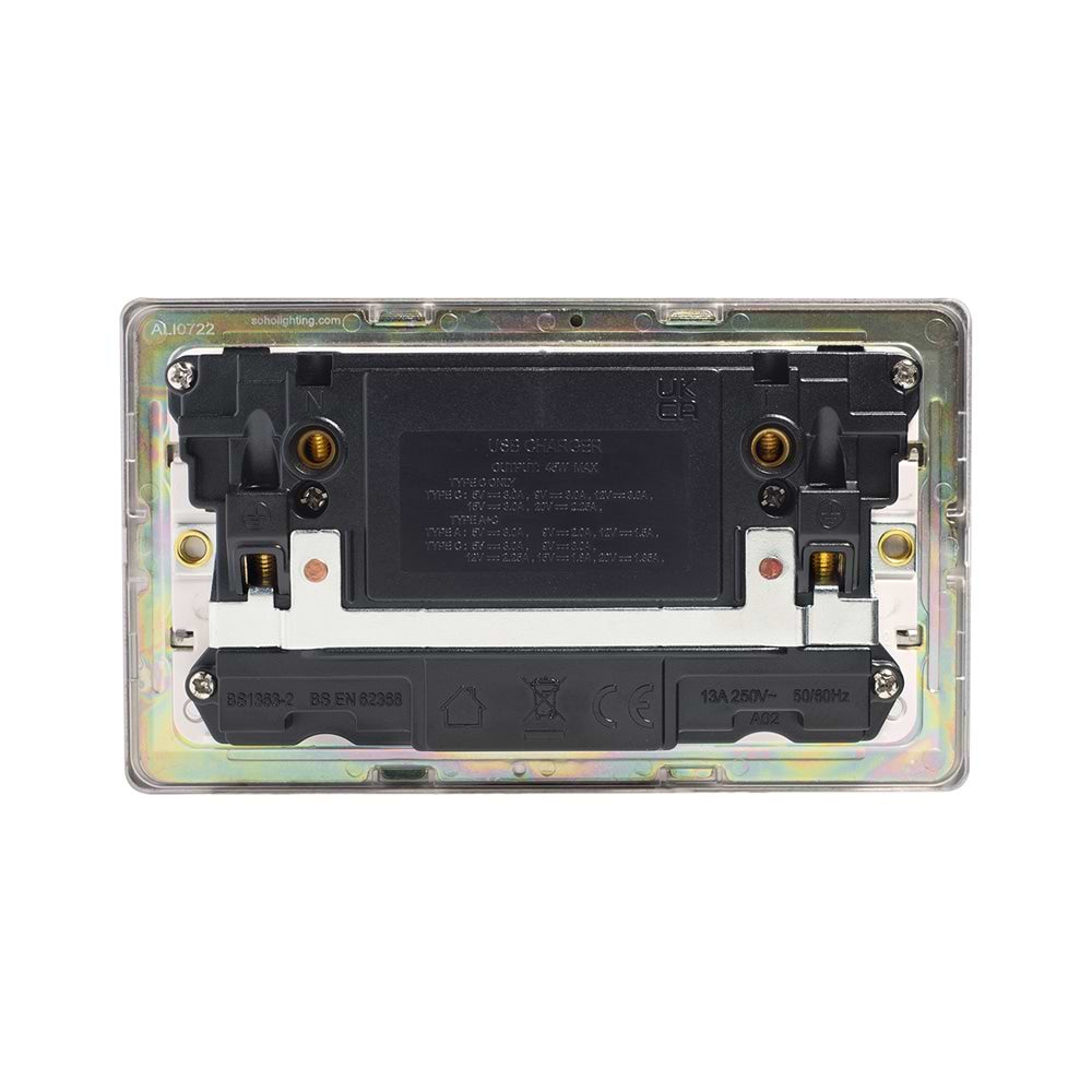 This Brushed Brass Traditional Plate 13A 2 Gang Super Fast Charge USB A+C Socket carries the distinctive look and elegant screwless finish of Soho Lighting's brushed brass range, providing a warm tone and the added benefit of hiding fingerprints and small blemishes.
