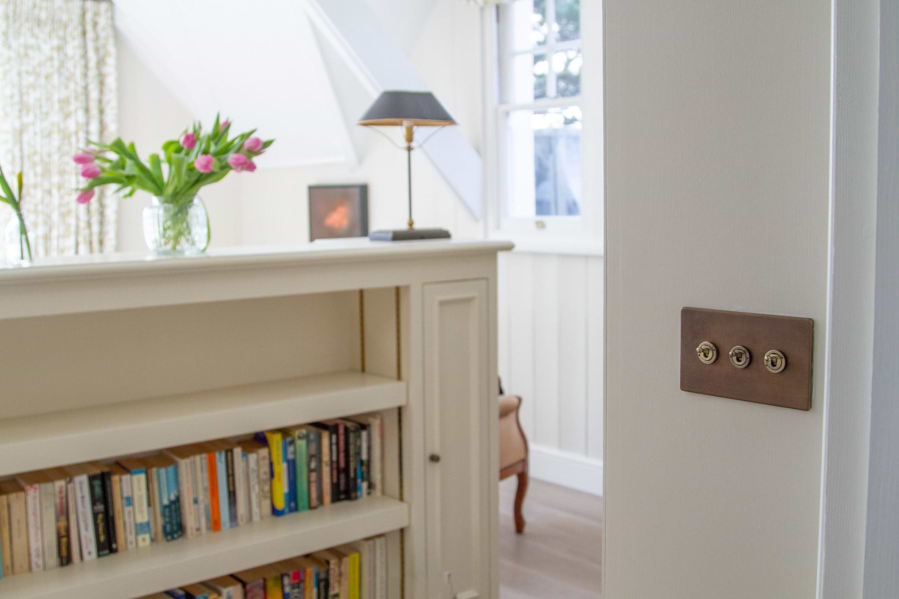 This Vintage Brass Traditional Plate 3 Gang 2 Way Toggle Switch has a vintage brass finish that has been carefully matched to original Georgian and Victorian brass works such as door handles and cabinetry details, giving a faithful representation of heavily oxidised, un-polished, timeworn brass, with a rich sumptuous dark matt patina.This means that no two plates look exactly the same, adding to their authentic look.
