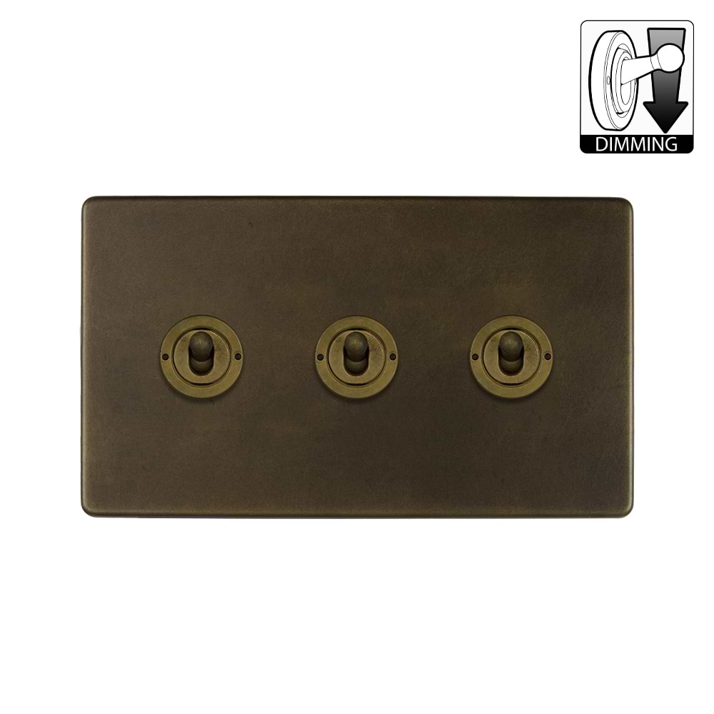 This Vintage Brass Traditional Plate 3 Gang Dimming Toggle Switch has a vintage brass finish that has been carefully matched to original Georgian and Victorian brass works such as door handles and cabinetry details, giving a faithful representation of heavily oxidised, un-polished, timeworn brass, with a rich sumptuous dark matt patina.This means that no two plates look exactly the same, adding to their authentic look.