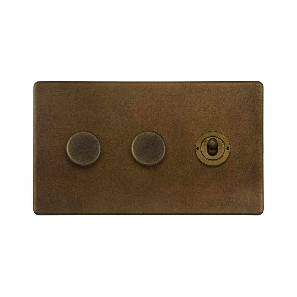 This Vintage Brass Traditional Plate Screwless 3 Gang Dimmer and Toggle Switch Combo is made up of 2 x 2 Way Intelligent Dimmer 150W LED (300w Halogen/Incandescent) and 1 x 20A Toggle 2-way switch has a vintage brass finish. This means that no two plates look exactly the same, adding to their authentic look.