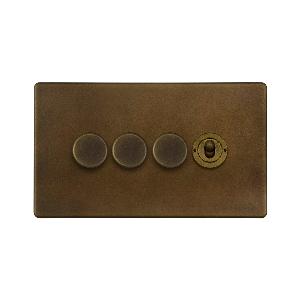 The Westminster Collection Vintage Brass 4 Gang Switch with 3 Dimmers (3 x 150W LED Dimmer 1 x 20A 2 Way Toggle)