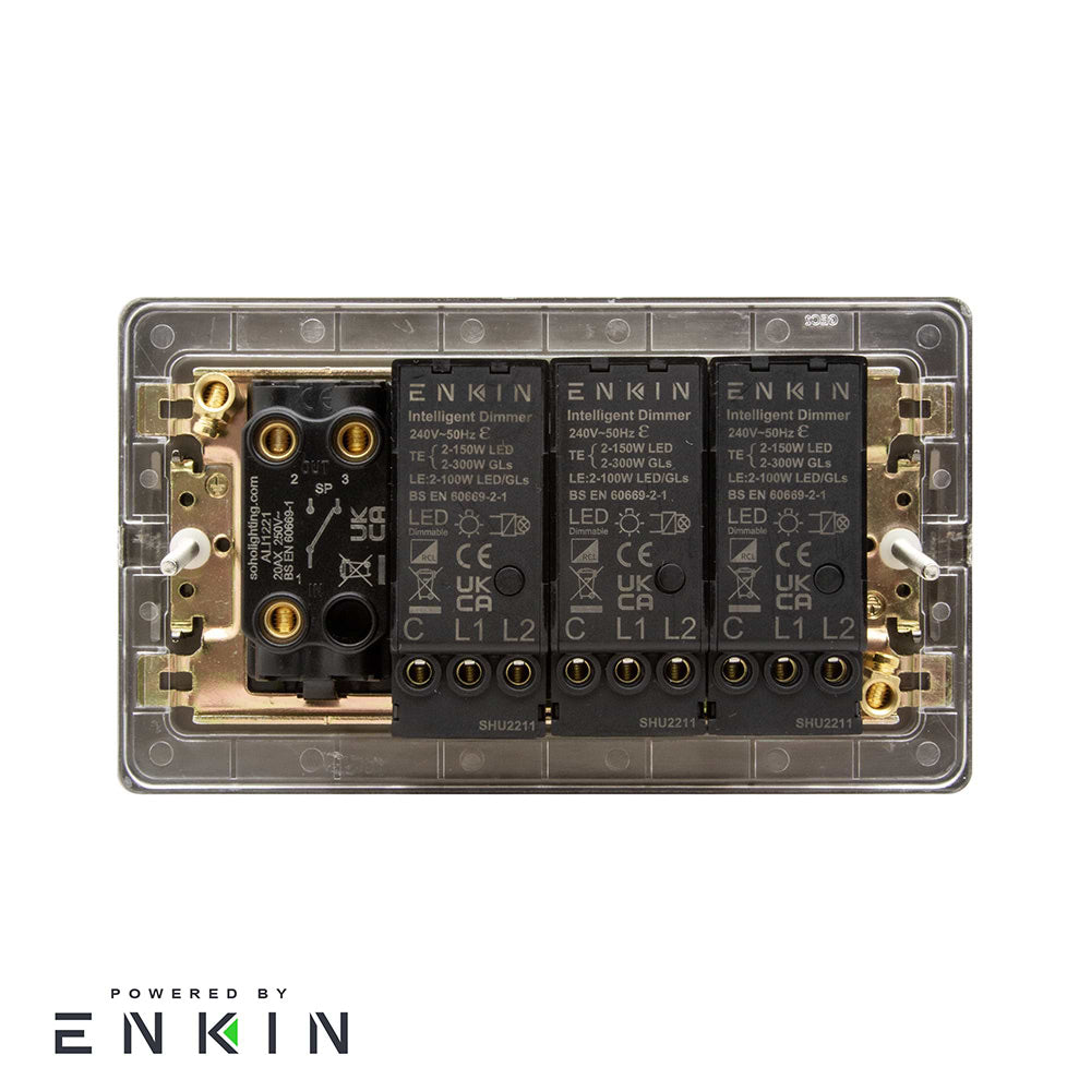 This dimmer/toggle switch comes with award winning Enkin PDM150. This is a 2-way Intelligent Dimmer, LED compatible dimmer switch with soft-start technology that slowly brings the lights to the set level in about 1-2 second, prolonging the life of your lightbulbs, as well as an easy push button setup for seamless installation. Enkin modules are silent and flicker-free With short circuit and overload protection, and a self-recovering thermal fuse, the award-winning technology that makes up Enkin modules provides safety and reliability to a previously overlooked element of your home lighting.