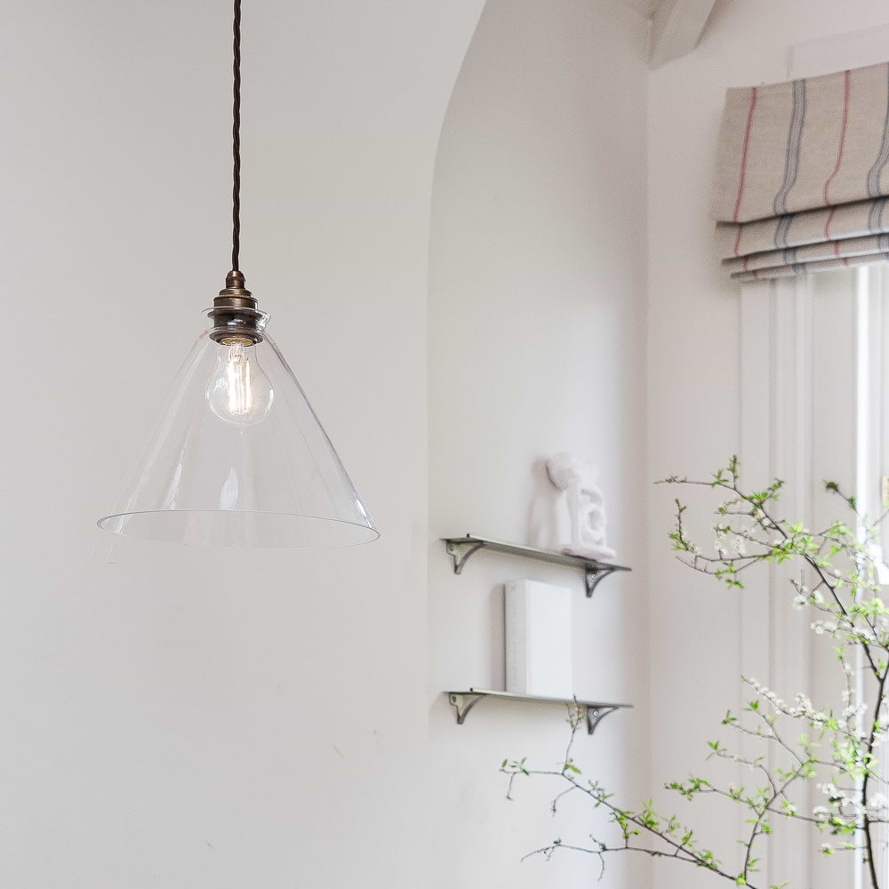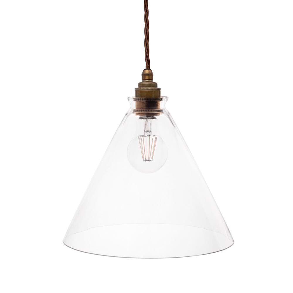 The tall conical shape of the Thomas clear glass pendant light exudes effortless sophistication, pleasantly illuminating any classically styled space, a real twist on the classic shade pendant.