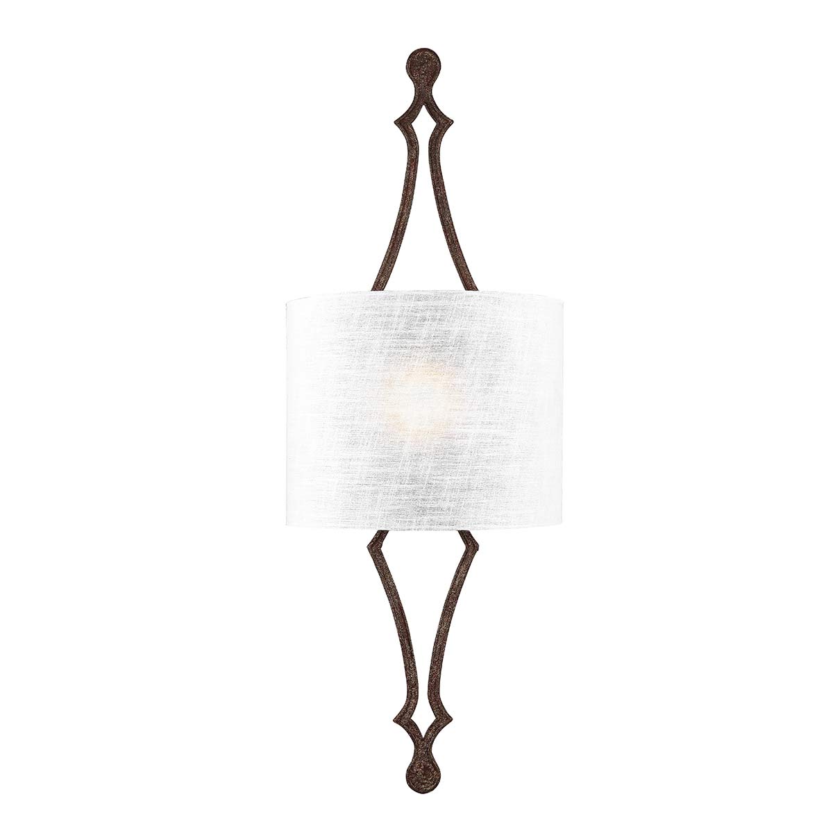 the oversized profile of the Tilling wall light makes a statement with its traditional styling and use of Weathered Iron and Distressed Gold-leaf finishes. The fixture is nicely balanced by a White Linen shade