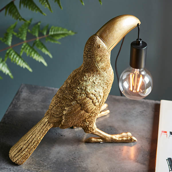 A quirky toucan table light exclusively designed in the UK, in a vintage gold paint finish. Characteristic features come to life when paired with a lamp.