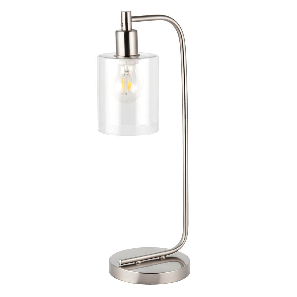 A modern table light for contemporary interiors. Brushed nickel finish with clear glass shade and inline switch.