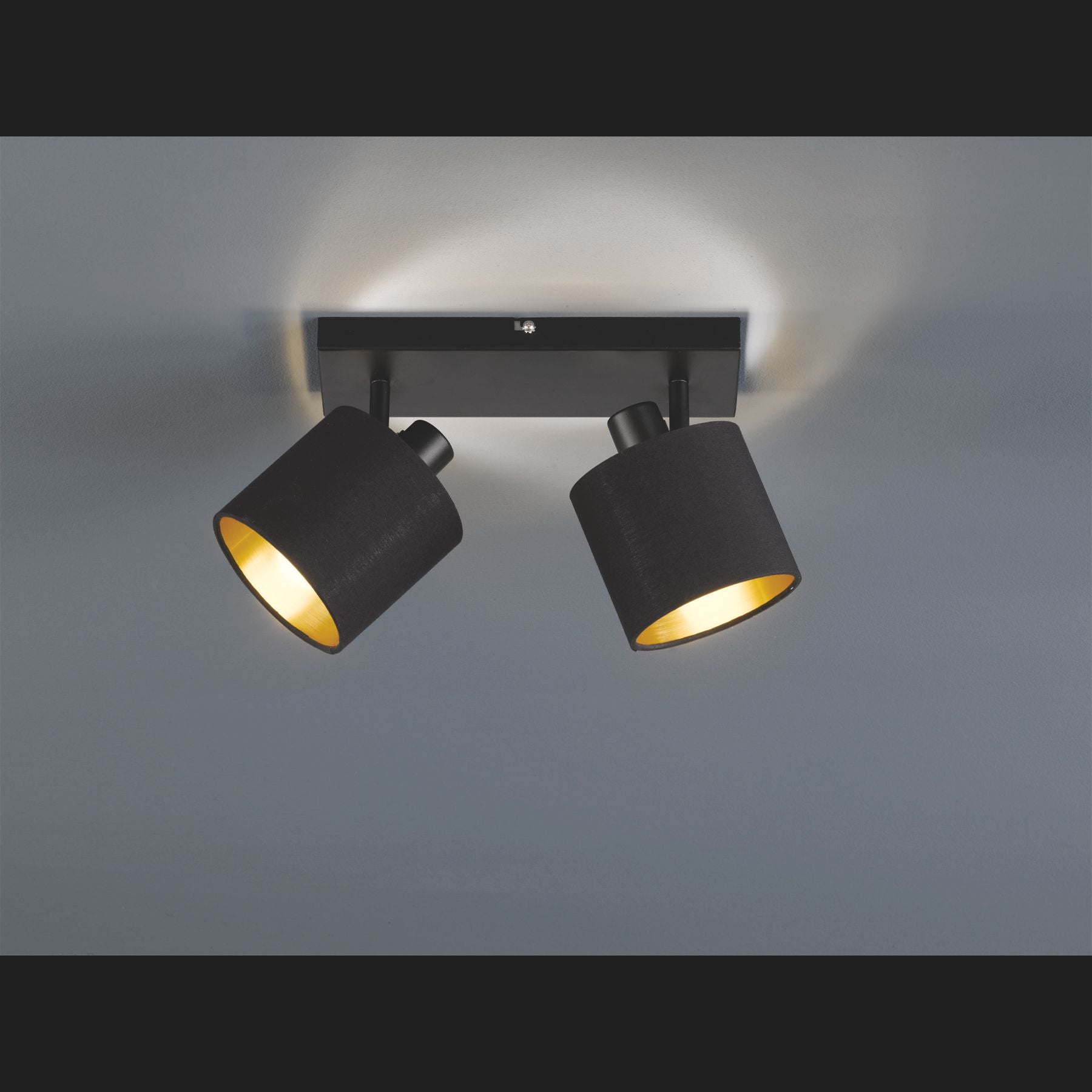 The spotlights in the TOMMY range provide cosy lighting, as textile shades increase the comfort factor and conjure up a cosy ambience. At the same time, the clear shapes conjure up a modern and simple style that can be used and combined in a variety of ways. The two-bulb spotlight measures 28x18cm and can be used as a supplementary or orientation light as well as for small living spaces. The swivelling heads can also be specifically aligned to deliberately highlight individual areas. The light is made of matt black metal and is complemented by two fabric shades in the modern colour combination of black and gold. The combination creates stylish lighting accents and gives living spaces an extraordinary feel-good effect. For energy-saving lighting, it is recommended to use an LED illuminant. These are an optimal alternative to conventional halogen lamps and stand for a high quality of light and energy savings of up to 80%. In addition, LED lamps help you benefit from a long service life, low heat generation and at the same time protect the environment.