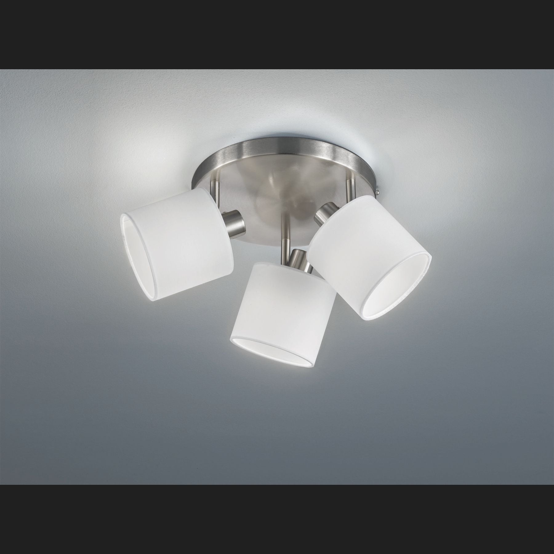 The spotlights in the TOMMY range provide cosy lighting, as textile shades increase the comfort factor and conjure up a cosy ambience. At the same time, the clear shapes conjure up a modern and simple style that can be used and combined in a variety of ways. The three-flame spotlight has a diameter of 25 cm and is ideal for illuminating small living spaces. The swivelling heads can also be specifically aligned to deliberately highlight individual areas. The luminaire is made of metal in matt nickel and is complemented by three white fabric shades. The combination creates modern and stylish lighting accents and gives living rooms a pleasant feel-good effect. For energy-saving lighting, it is recommended to use an LED illuminant. These are an optimal alternative to conventional halogen lamps and stand for a high quality of light and energy savings of up to 80%. In addition, LED lamps help you benefit from a long service life, low heat generation and at the same time protect the environment.
