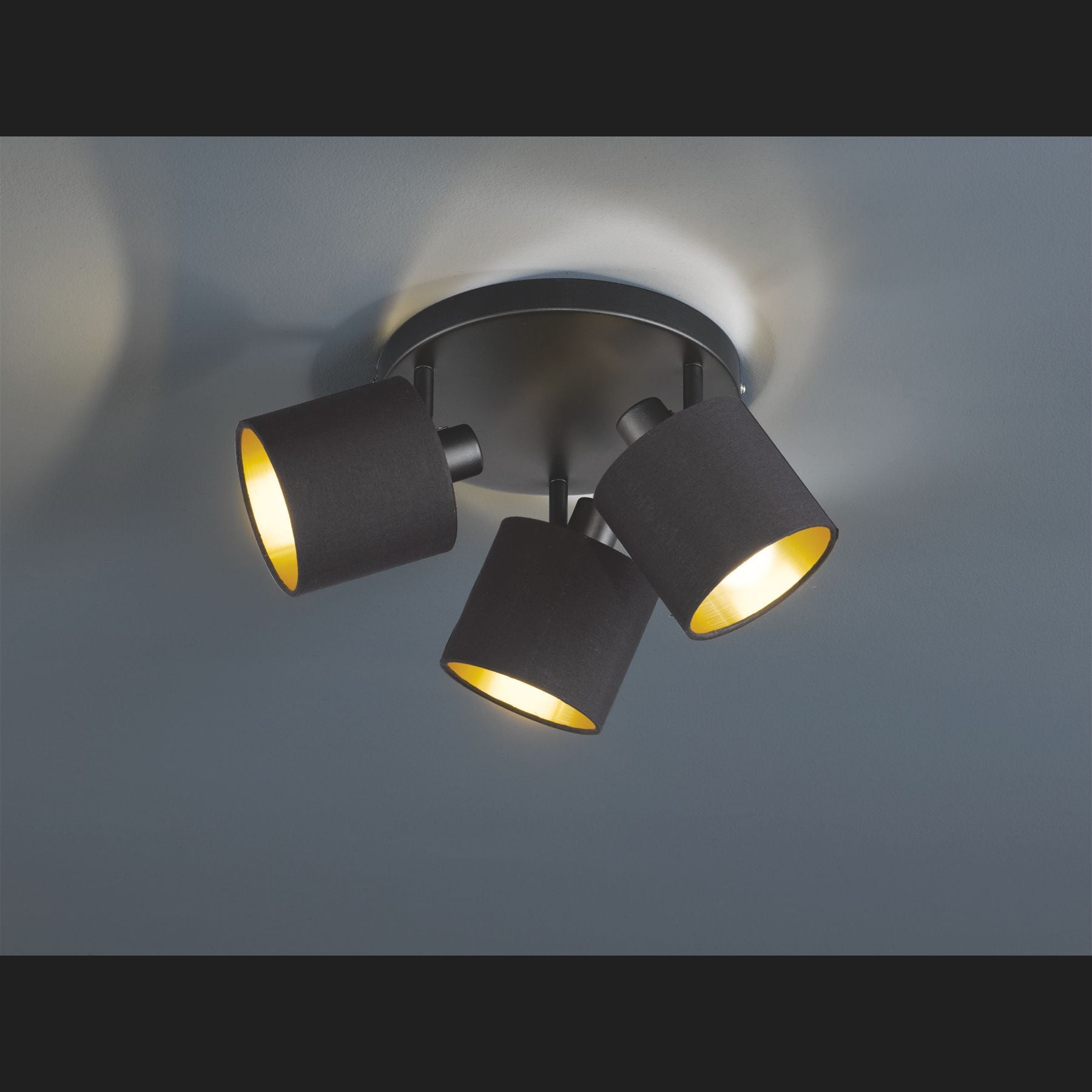 The spotlights in the TOMMY range provide cosy lighting, as textile shades increase the comfort factor and conjure up a cosy ambience. At the same time, the clear shapes conjure up a modern and simple style that can be used and combined in a variety of ways. The three-flame spotlight has a diameter of 25 cm and is ideal for illuminating small living spaces. The swivelling heads can also be specifically aligned to deliberately highlight individual areas. The luminaire is made of matt black metal and is complemented by three fabric shades in the modern colour combination of black and gold. The combination creates stylish lighting accents and gives living spaces an extraordinary feel-good effect. For energy-saving lighting, it is recommended to use an LED illuminant. These are an optimal alternative to conventional halogen lamps and stand for a high quality of light and energy savings of up to 80%. In addition, LED lamps help you benefit from a long service life, low heat generation and at the same time protect the environment.