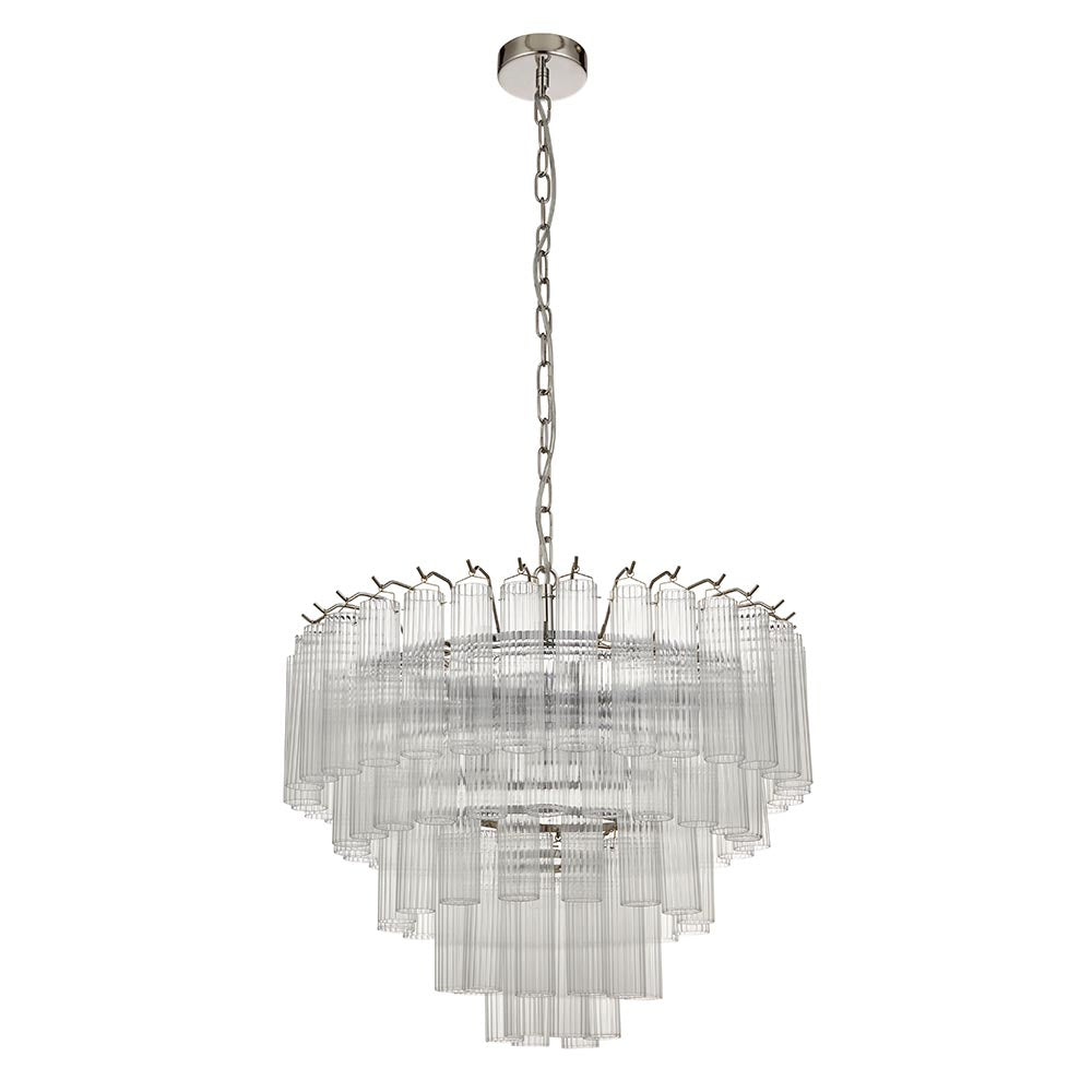Showstopping tiered tubular glass chandelier with fine ribbed cylindrical clear glass set amongst polished nickel metalwork. A stunning focal piece to light up an interior space with grandeur.